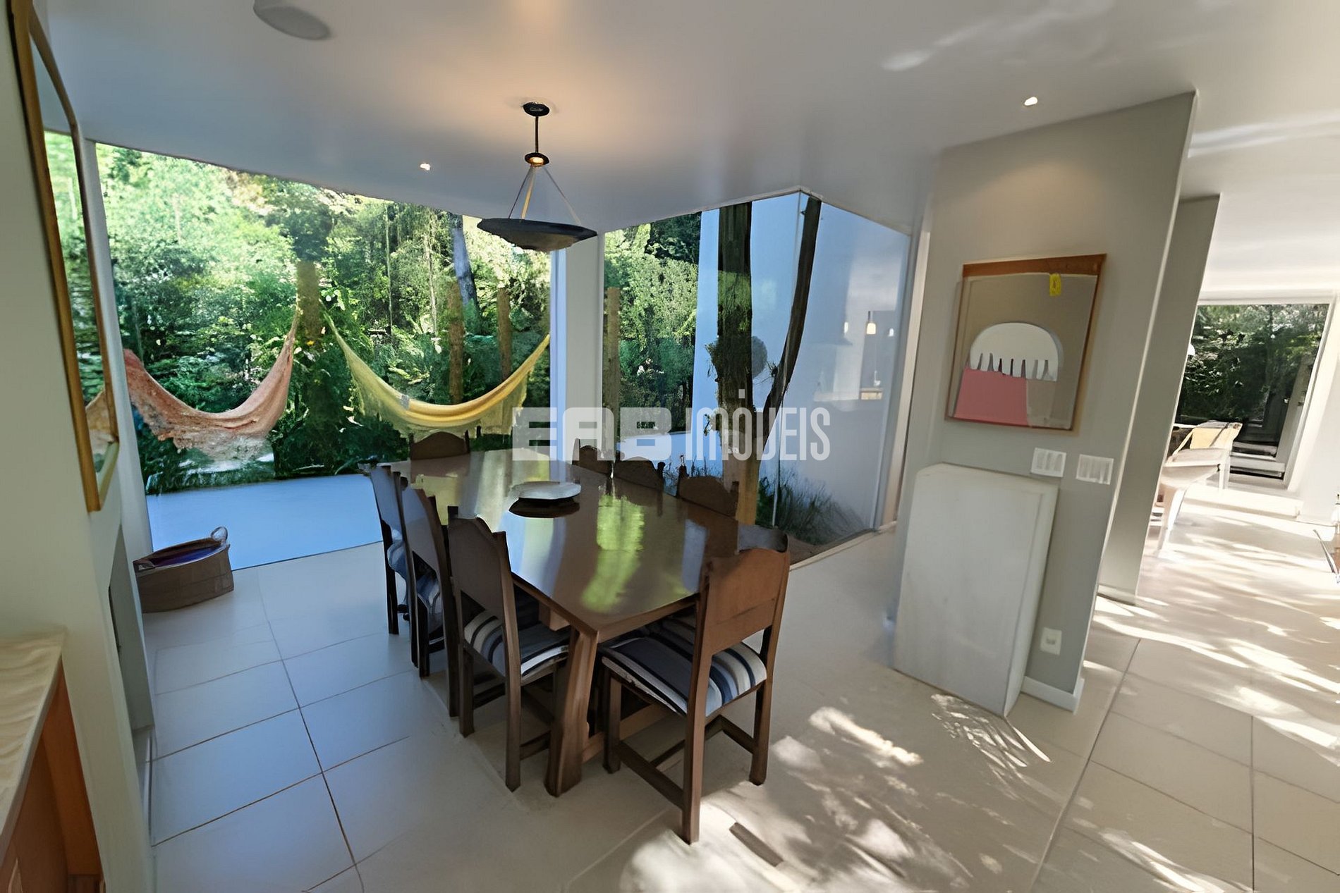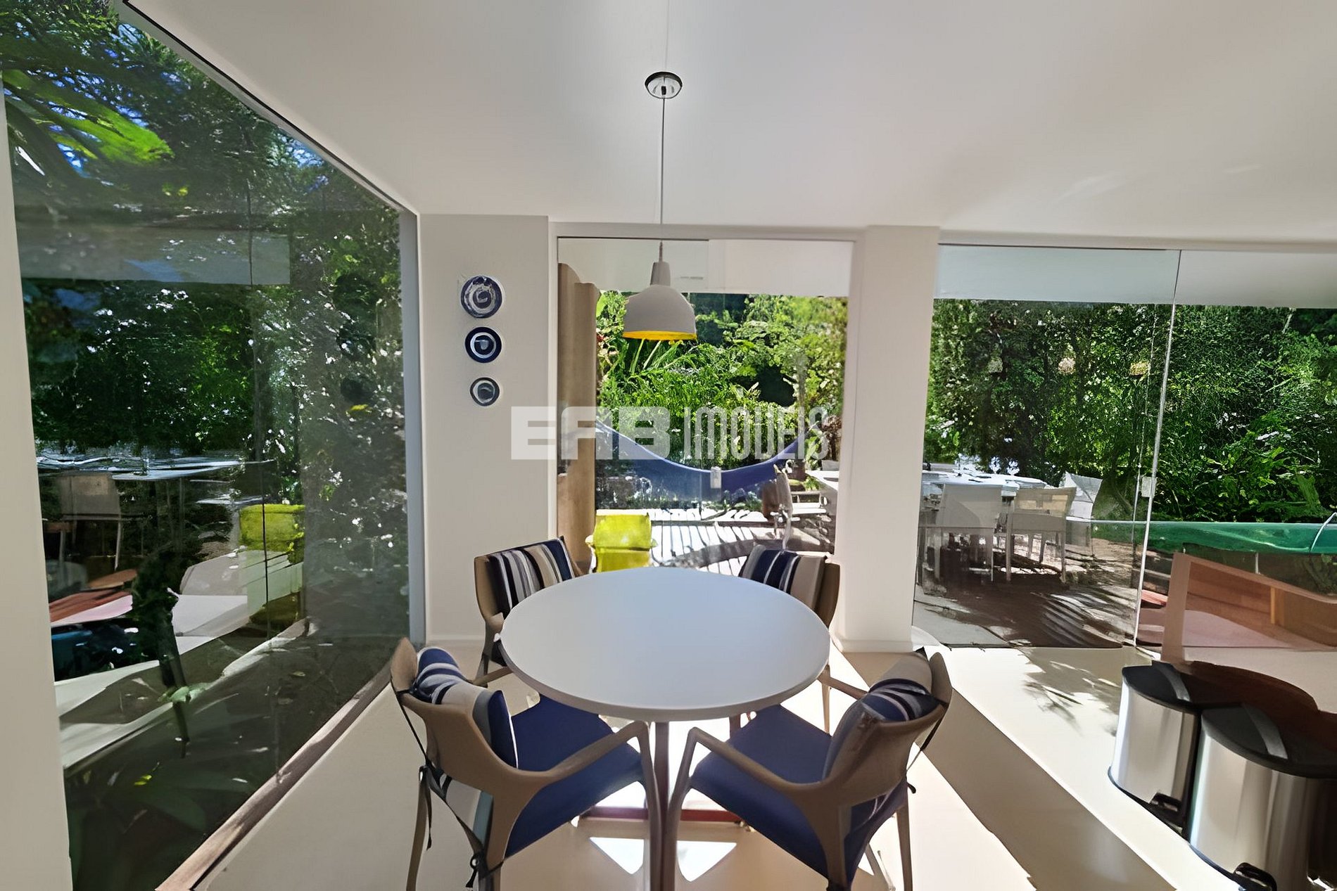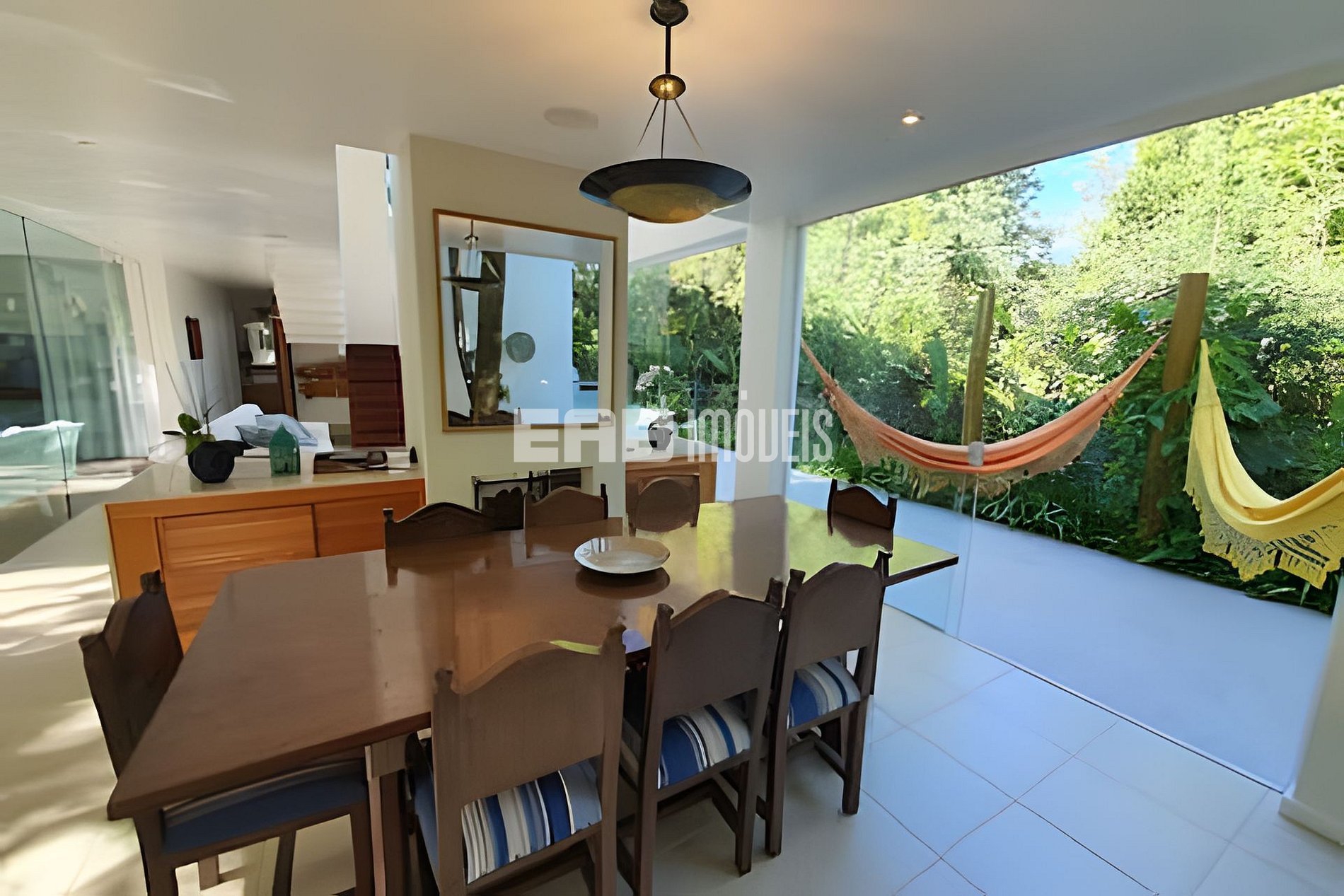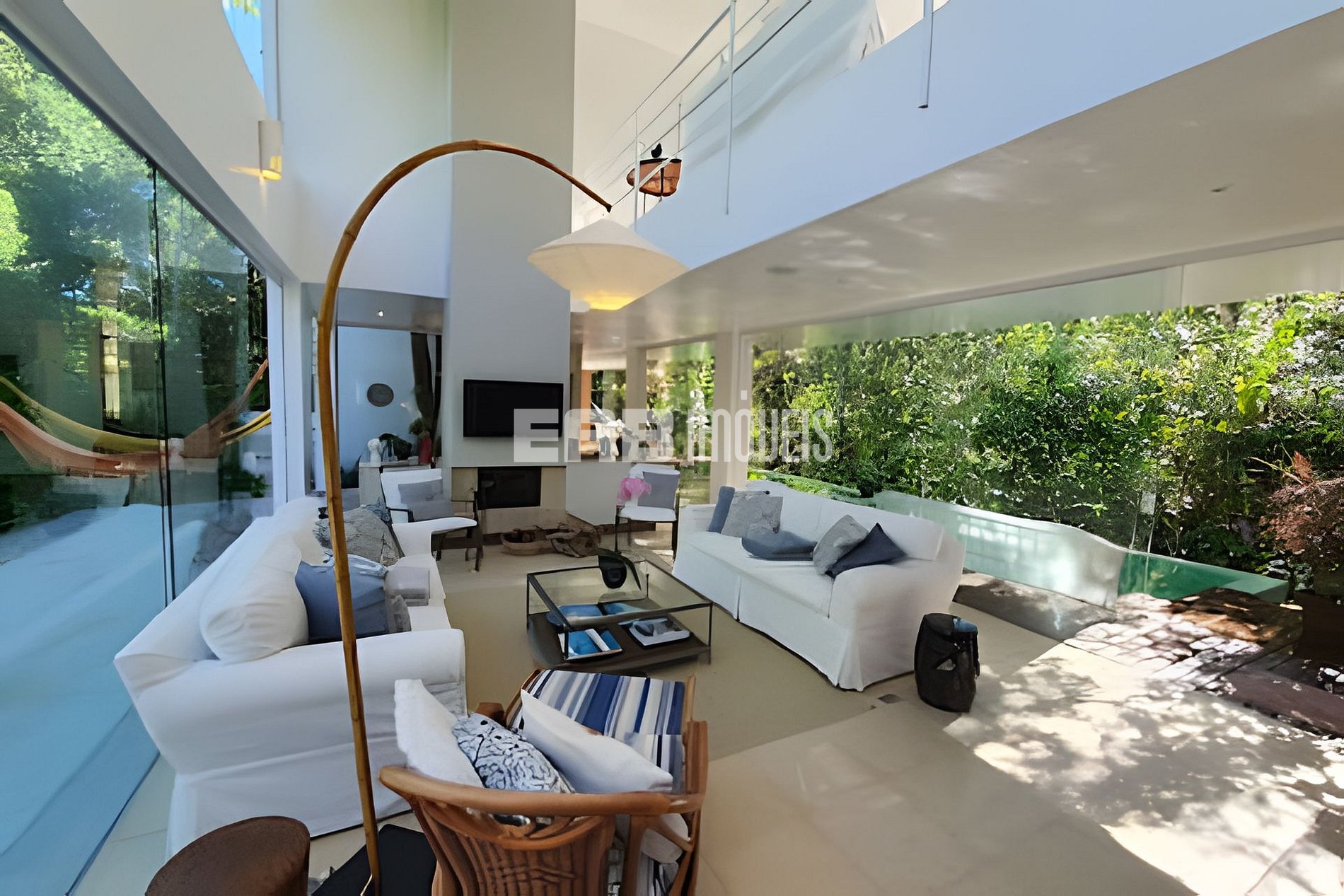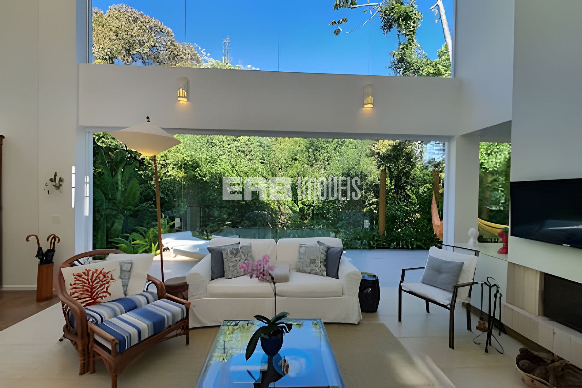 Com uma arquitetura marcada por amplas paredes de vidro, a natureza parece invadir os ambientes, criando uma experiência única de conexão com o entorno.