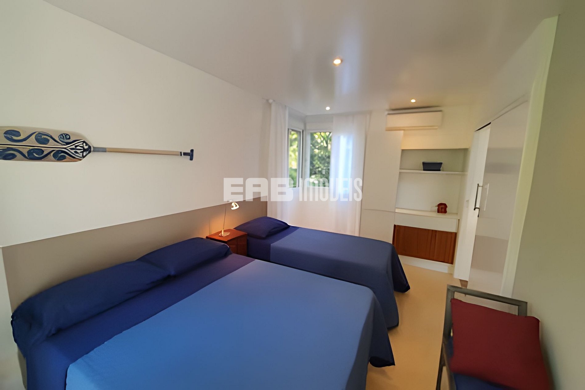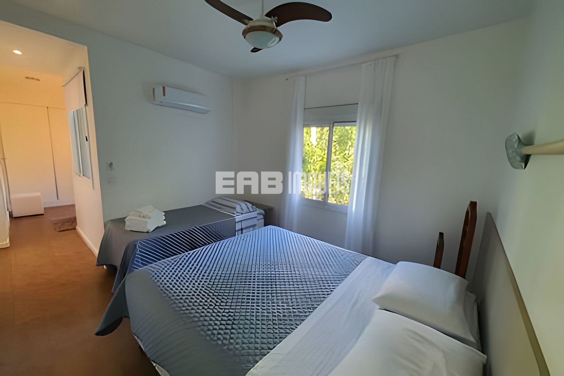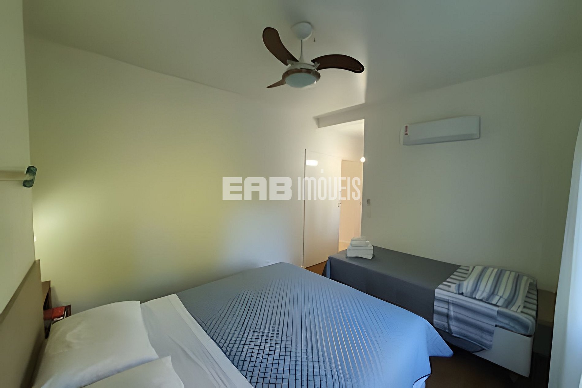 Quarto 3 (suíte): 1 cama de casal queen, 1 cama de solteiro, ventilador de teto, ar condicionado