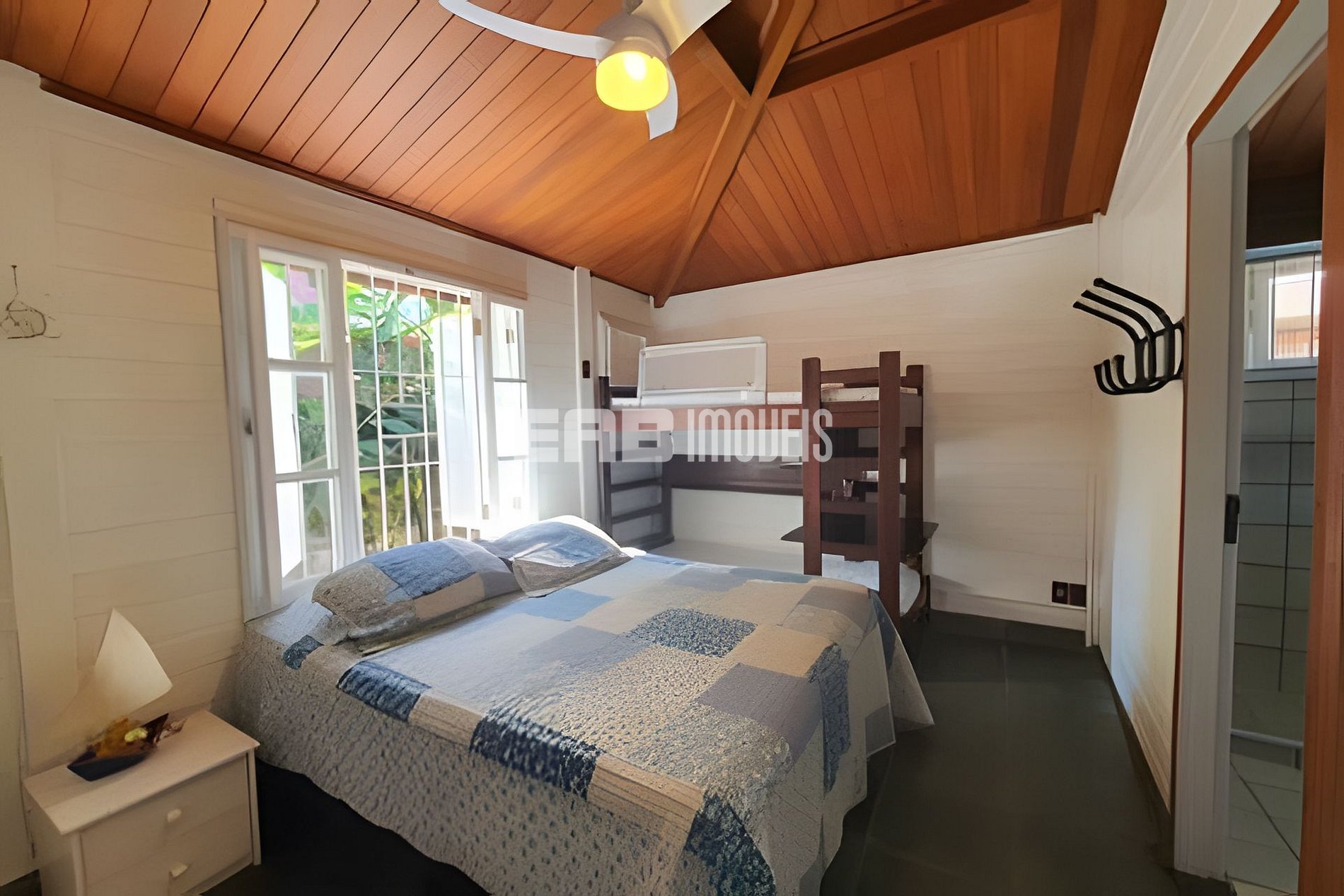 Quarto 3 (suíte): 1 cama de casal queen, 1 beliche, ventilador de teto, ar condicionado