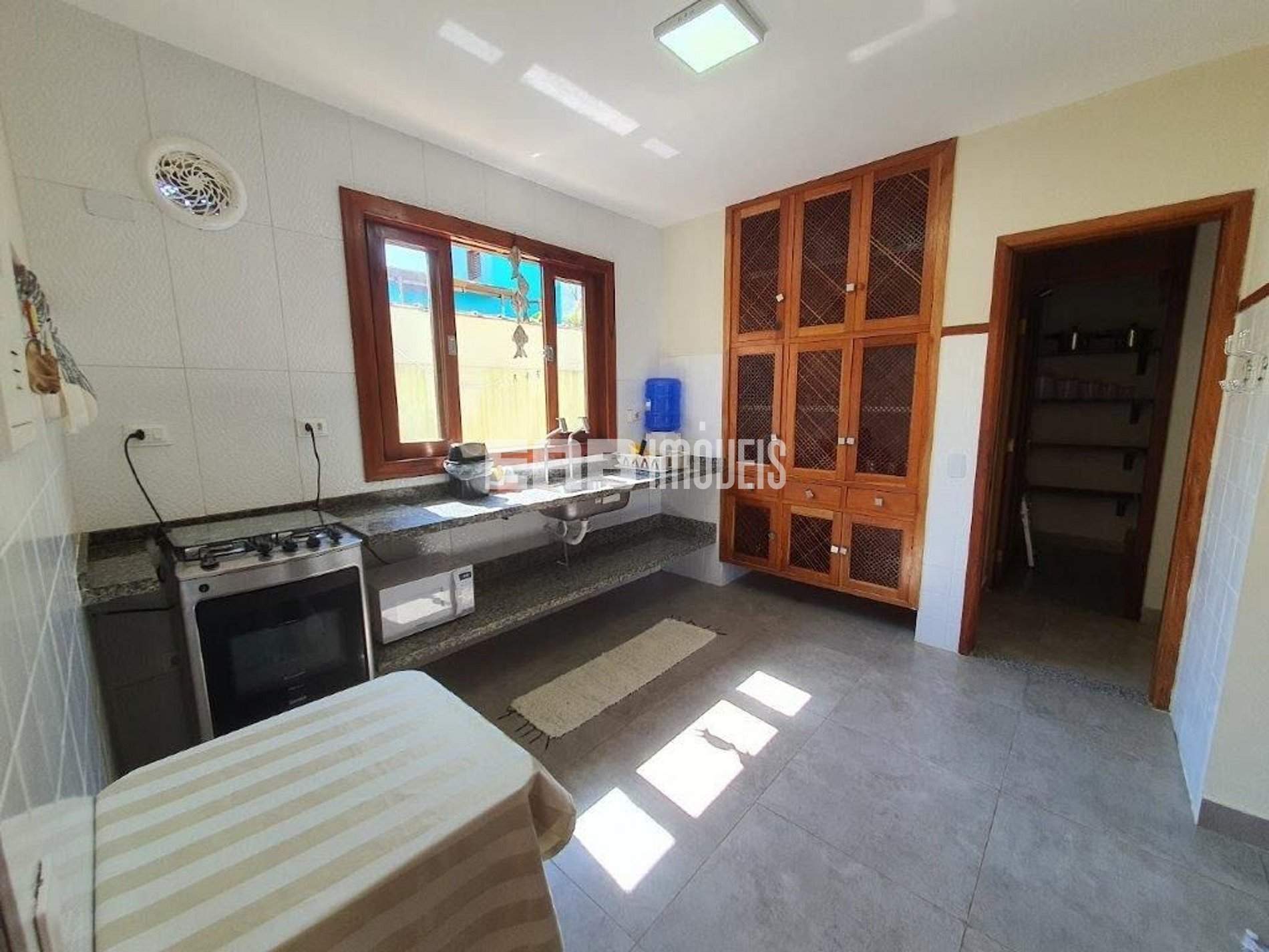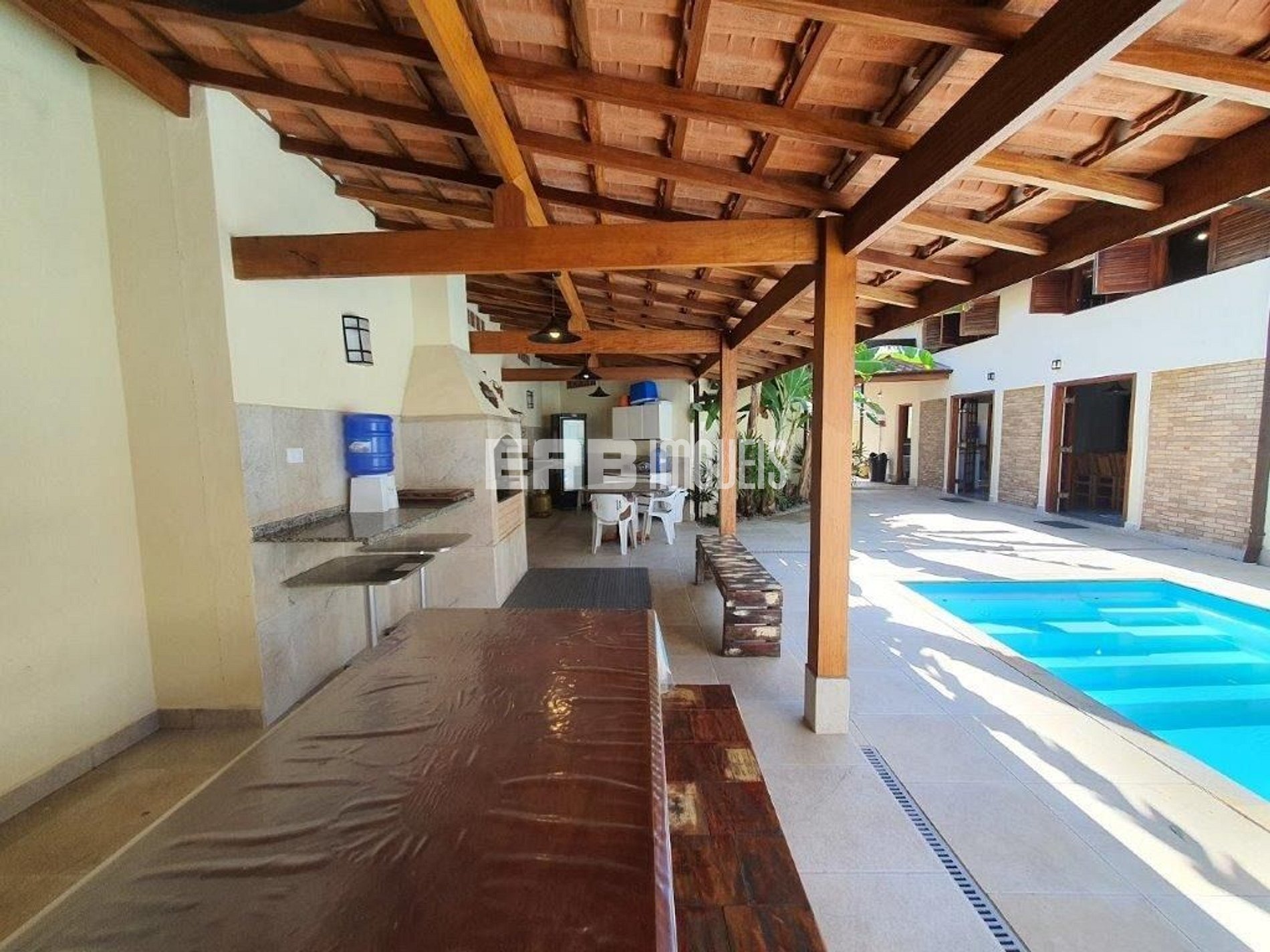 Ampla sala de 120m², de pé direito duplo, com 4 ambientes: sala de jantar com mesa de 12 lugares integrada à cozinha e com vista para a piscina e praça de lazer; sala de estar; sala de TV com Sky; e sala de bilhar. A casa possui 2 mezaninos, um dos jogos e outro do sono.