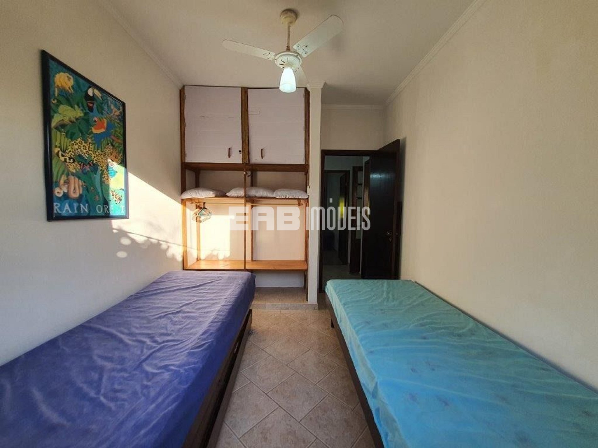 Quarto 2: 2 camas de solteiro, 1 cama auxiliar de solteiro, ar condicionado, ventilador de teto