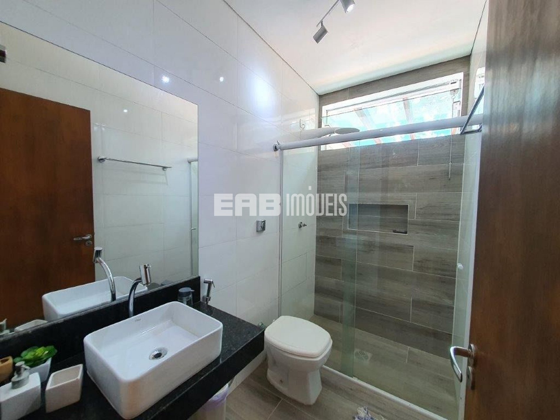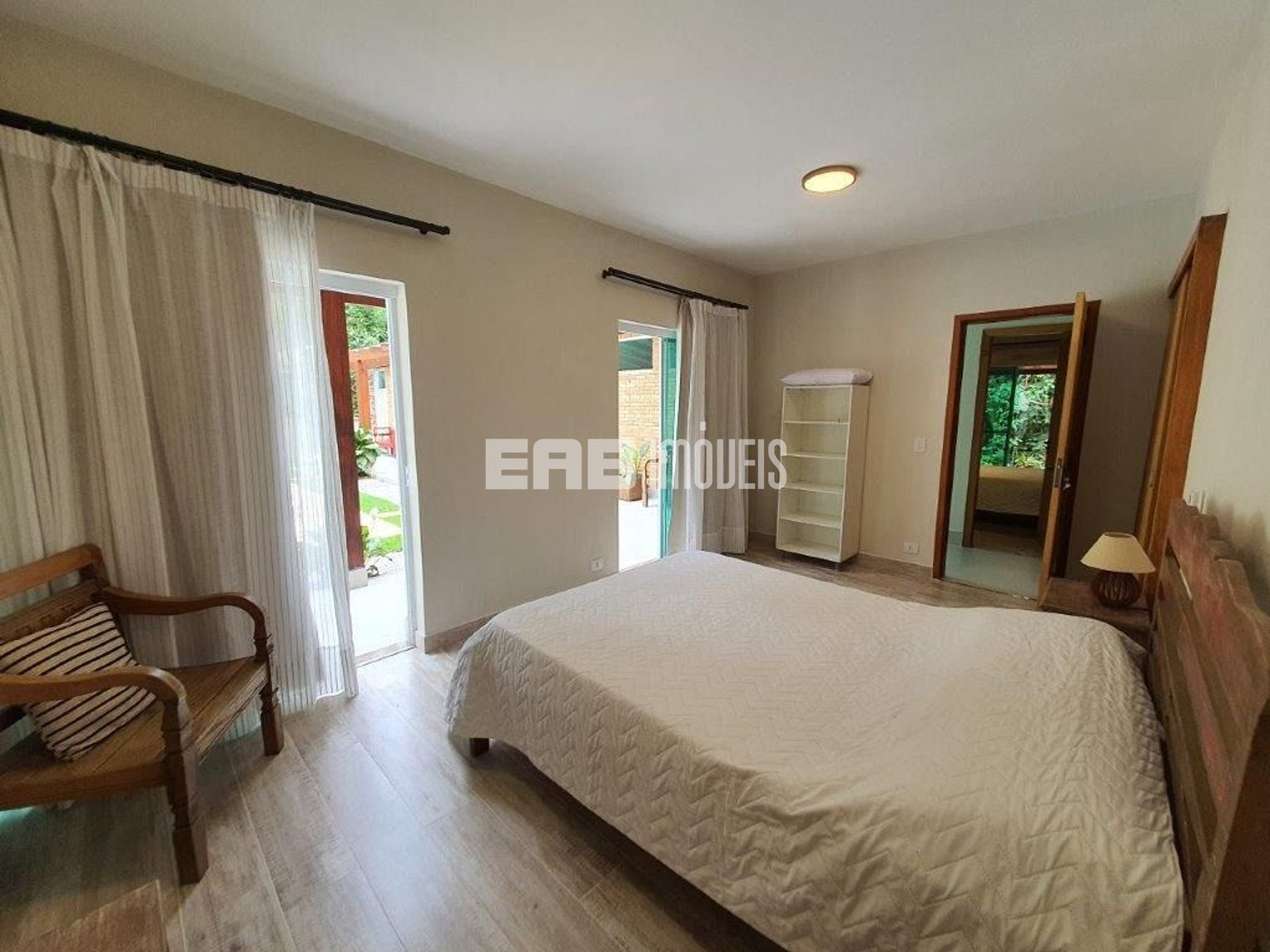 Quarto 3 (suíte): 1 cama de casal padrão, 1 cama auxiliar de solteiro, ventilador de teto, ar condicionado