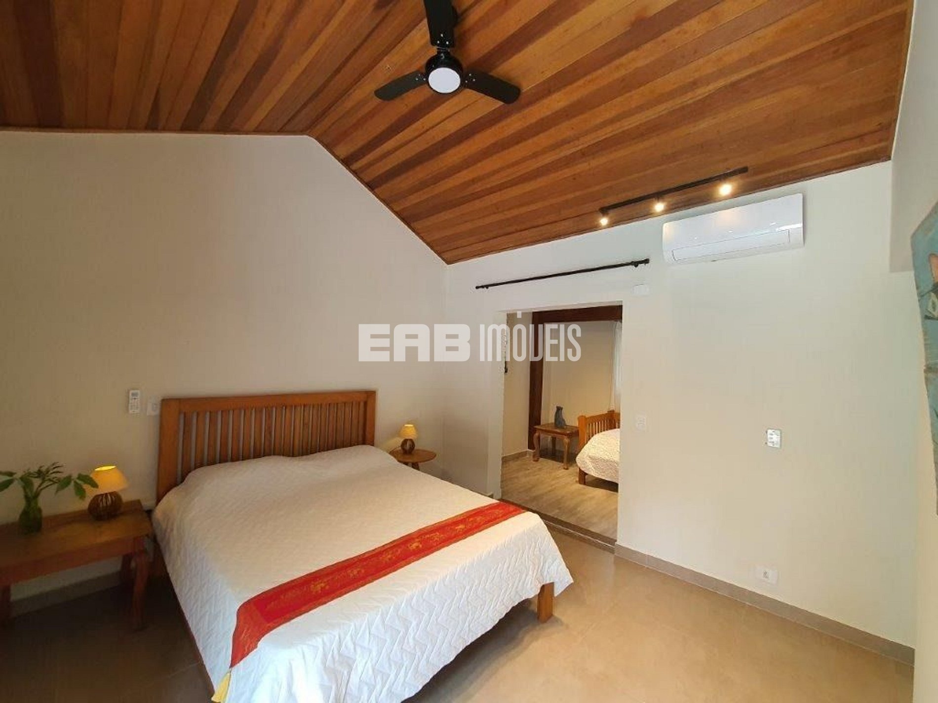 Quarto 2 (suíte): 1 cama de casal padrão, 1 cama auxiliar de solteiro, ventilador de teto, ar condicionado