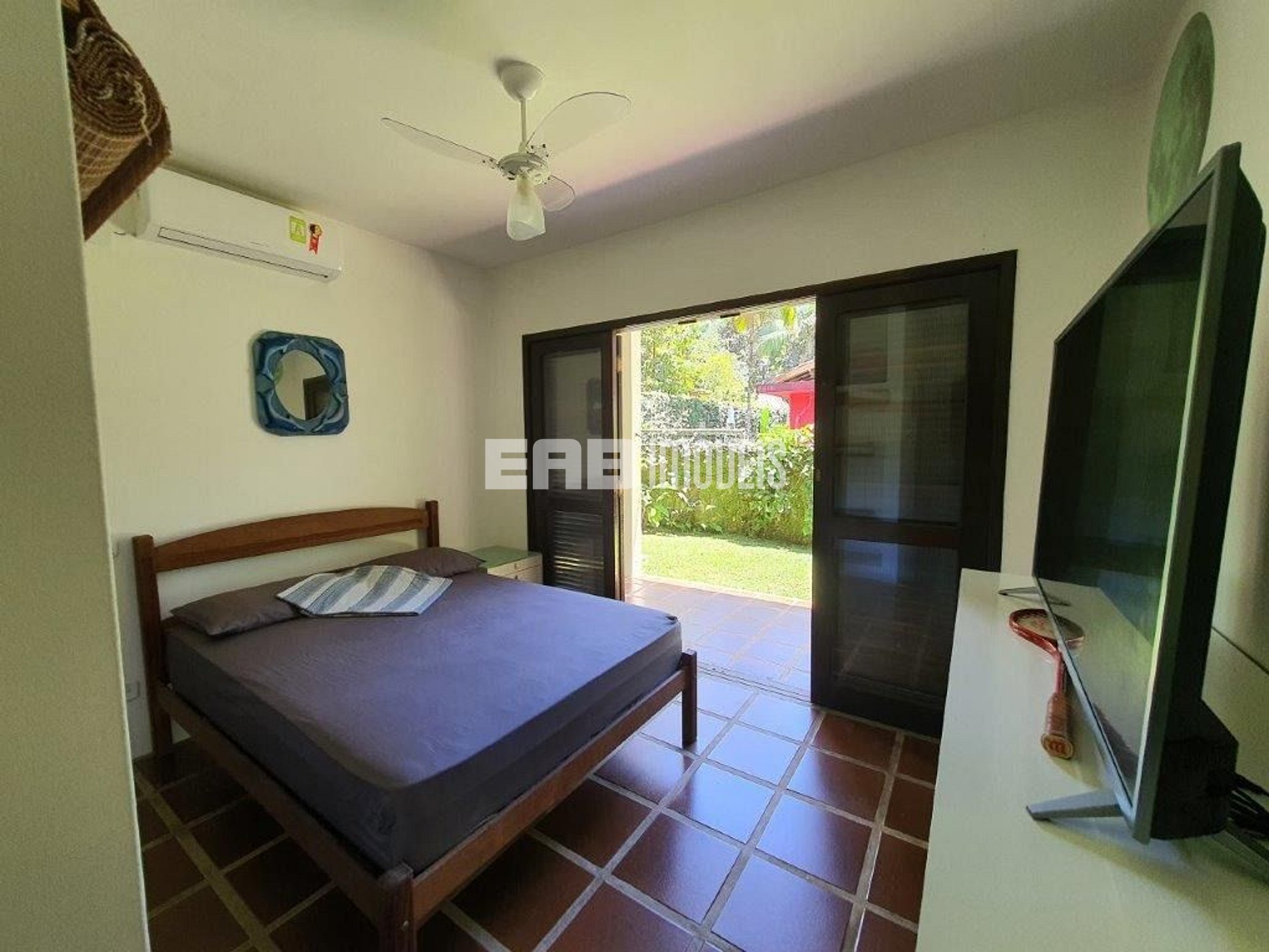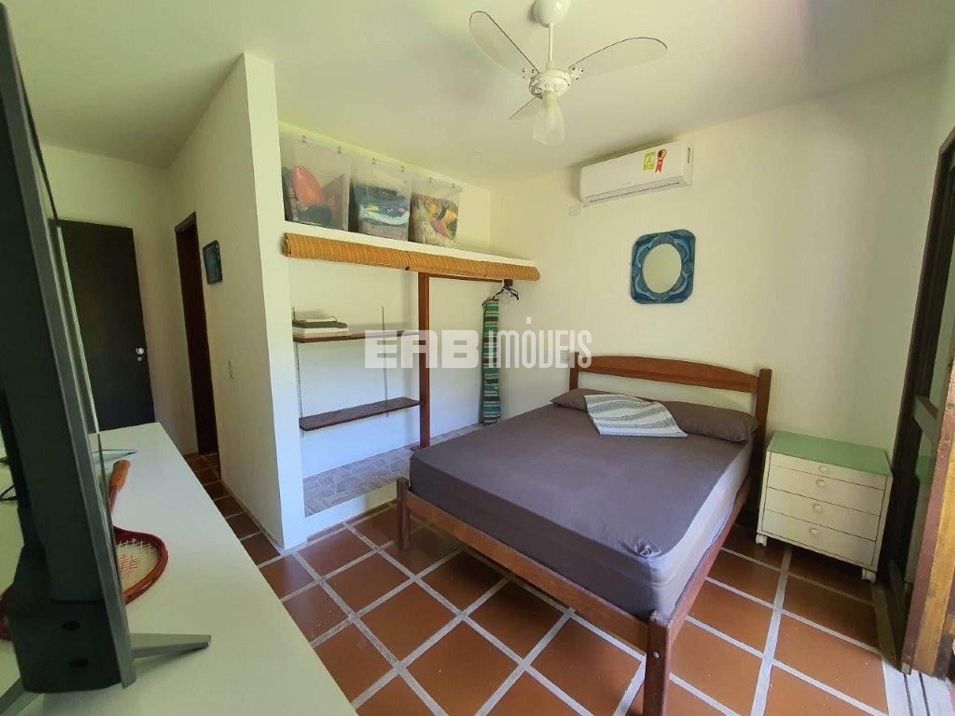 Quarto 1 (suíte): 1 cama de casal, ventilador de teto, ar condicionado