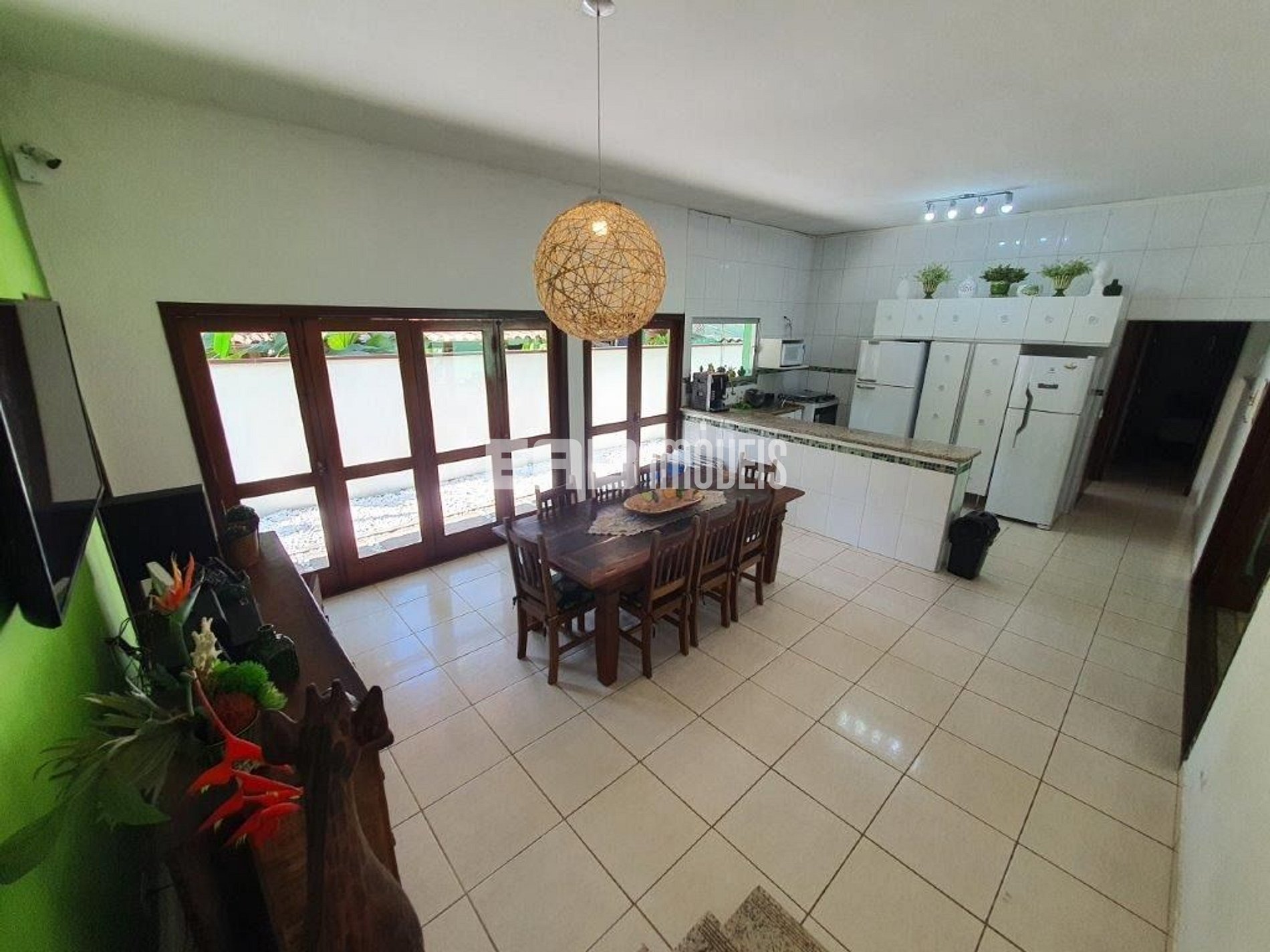 Sala de jantar integrada ao espaço gourmet, com churrasqueira, forno de pizza e vista para a piscina.