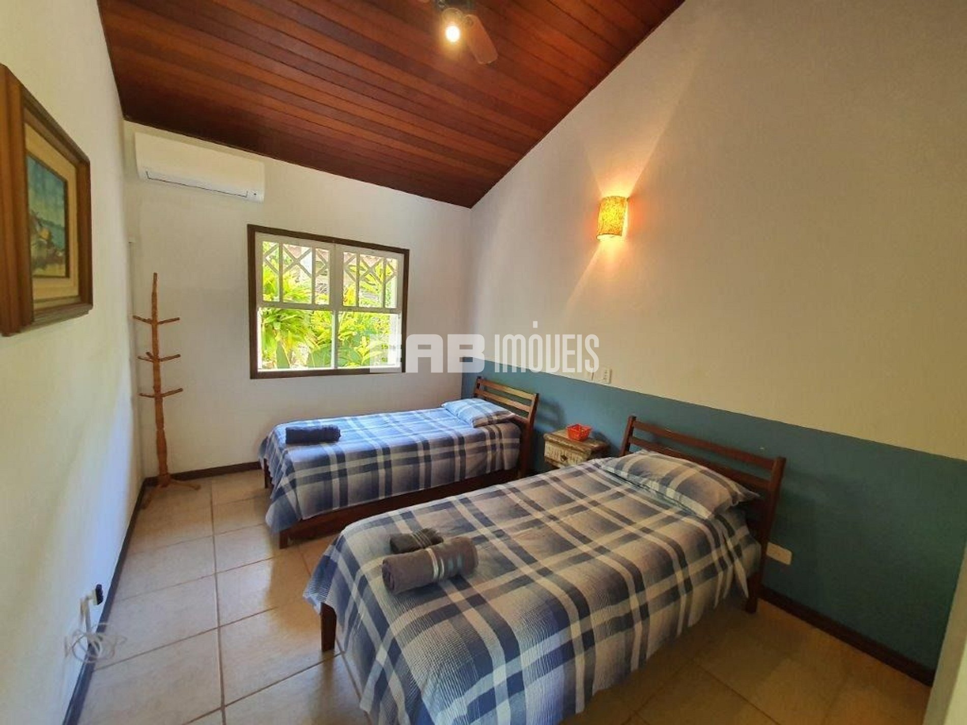 Quarto 4: 1 cama de casal, 1 cama de solteiro, 1 cama auxiliar de solteiro, ventilador de teto, ar condicionado