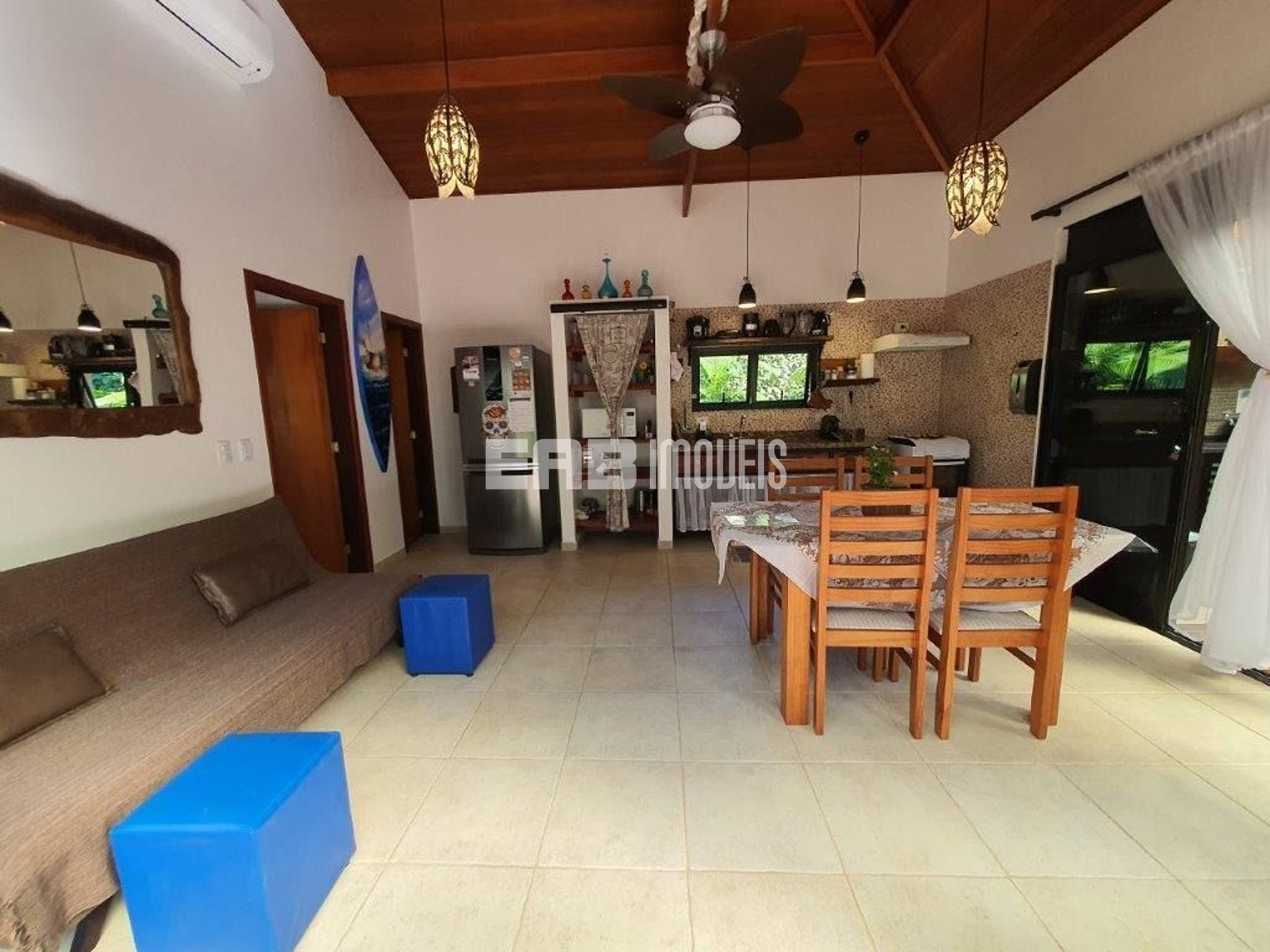 Quarto 1 (suíte): 1 cama de casal, 2 camas auxiliares, ventilador de teto, ar condicionado