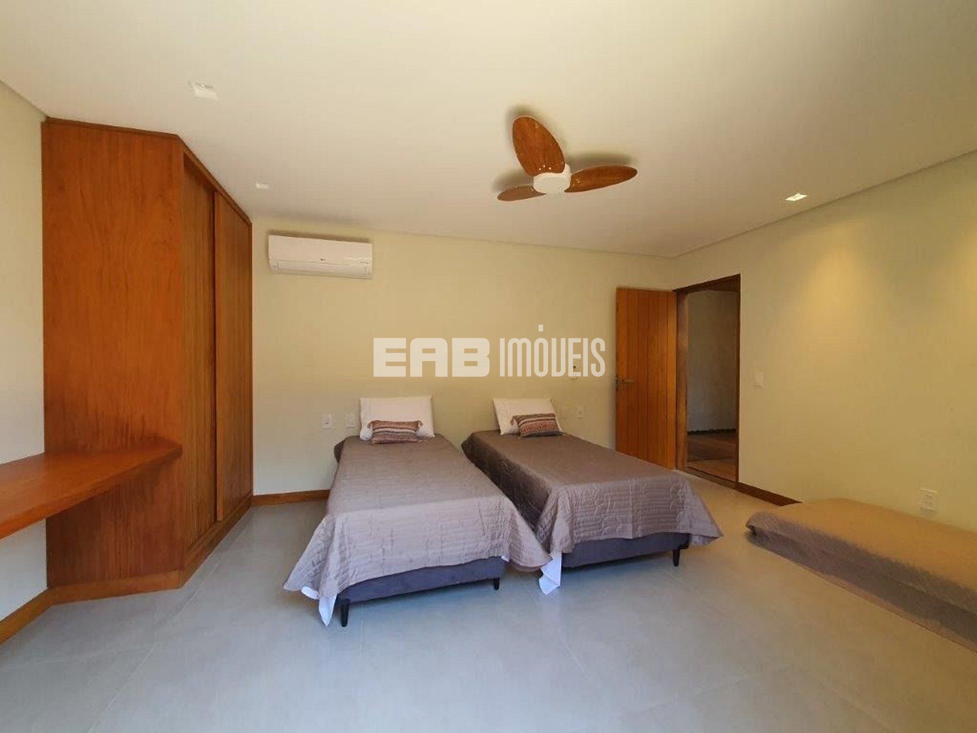 Quarto 4 (suíte): 1 cama de casal king, 1 cama auxiliar de solteiro, ventilador de teto, ar condicionado