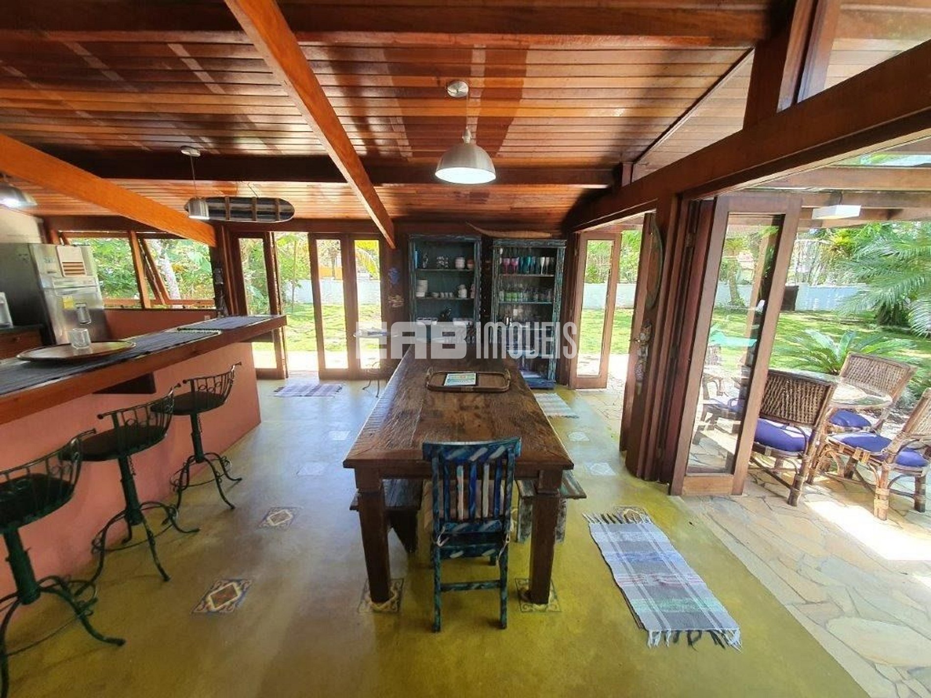Casa na praia de Itamambuca com piscina e extenso gramado. É composta por dois módulos. Um é a área gourmet com churrasqueira e cozinha, sala integrada e 2 dormitórios. No outro módulo, há mais uma sala e 3 dormitórios.