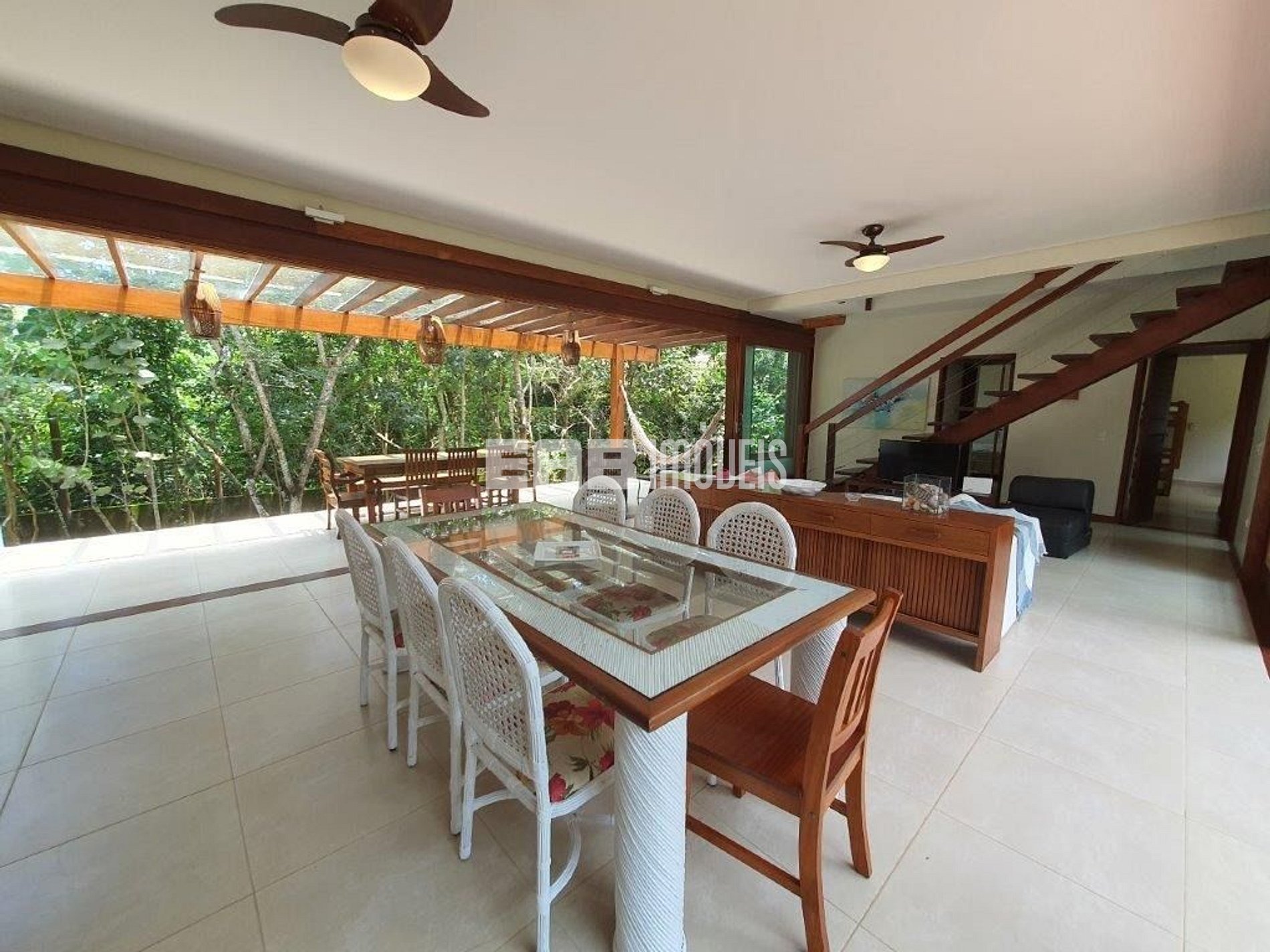 A sala abre-se inteira para a copa dos arbustos, trazendo muita paz e harmonia para dentro dos ambientes.