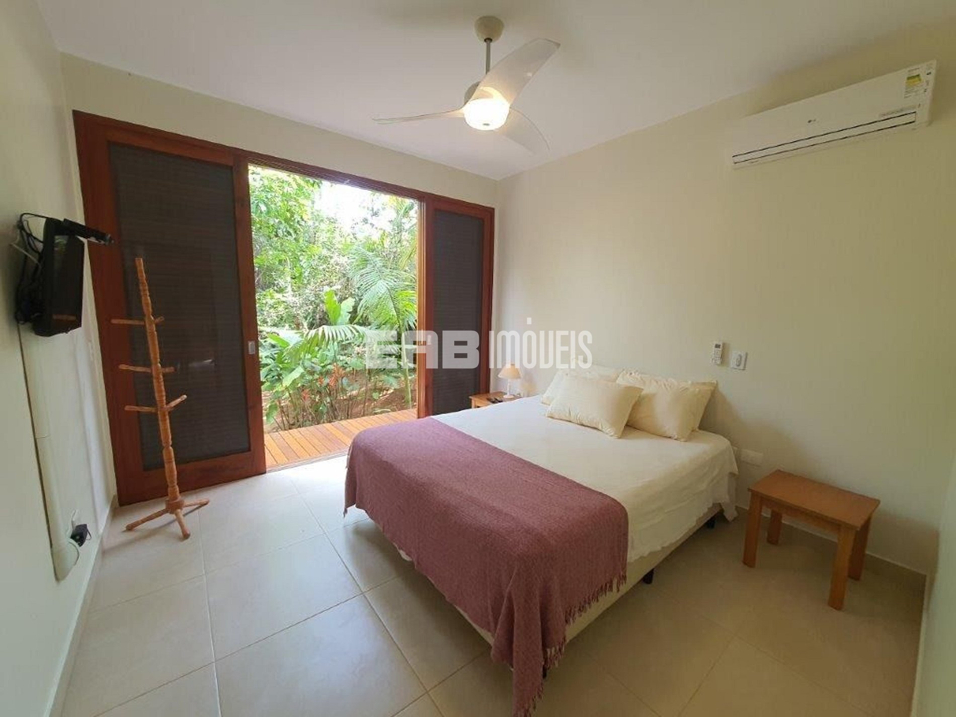 Quarto 1 (suíte): 1 cama de casal, ventilador de teto, ar condicionado