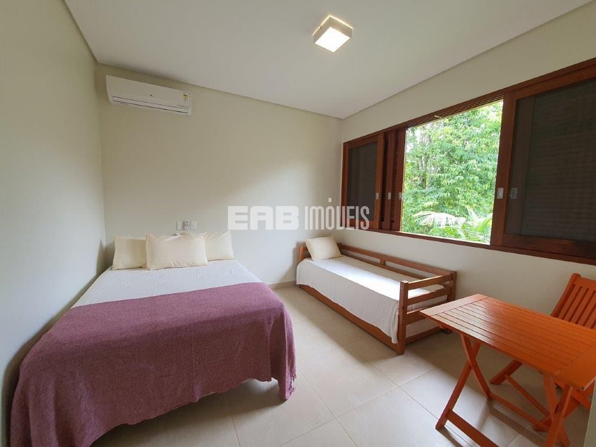Quarto 3 (suíte): 1 cama de casal, 1 cama de solteiro, 1 cama auxiliar de solteiro, ar condicionado