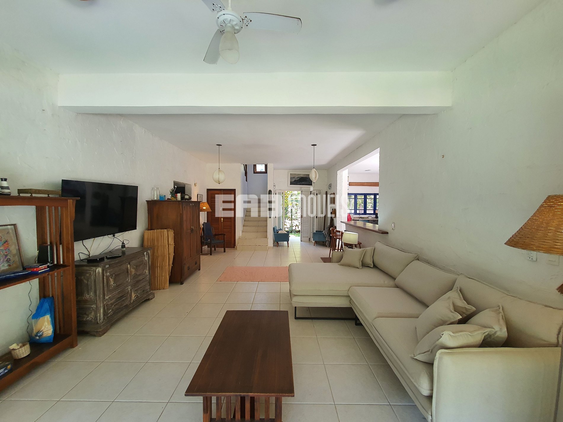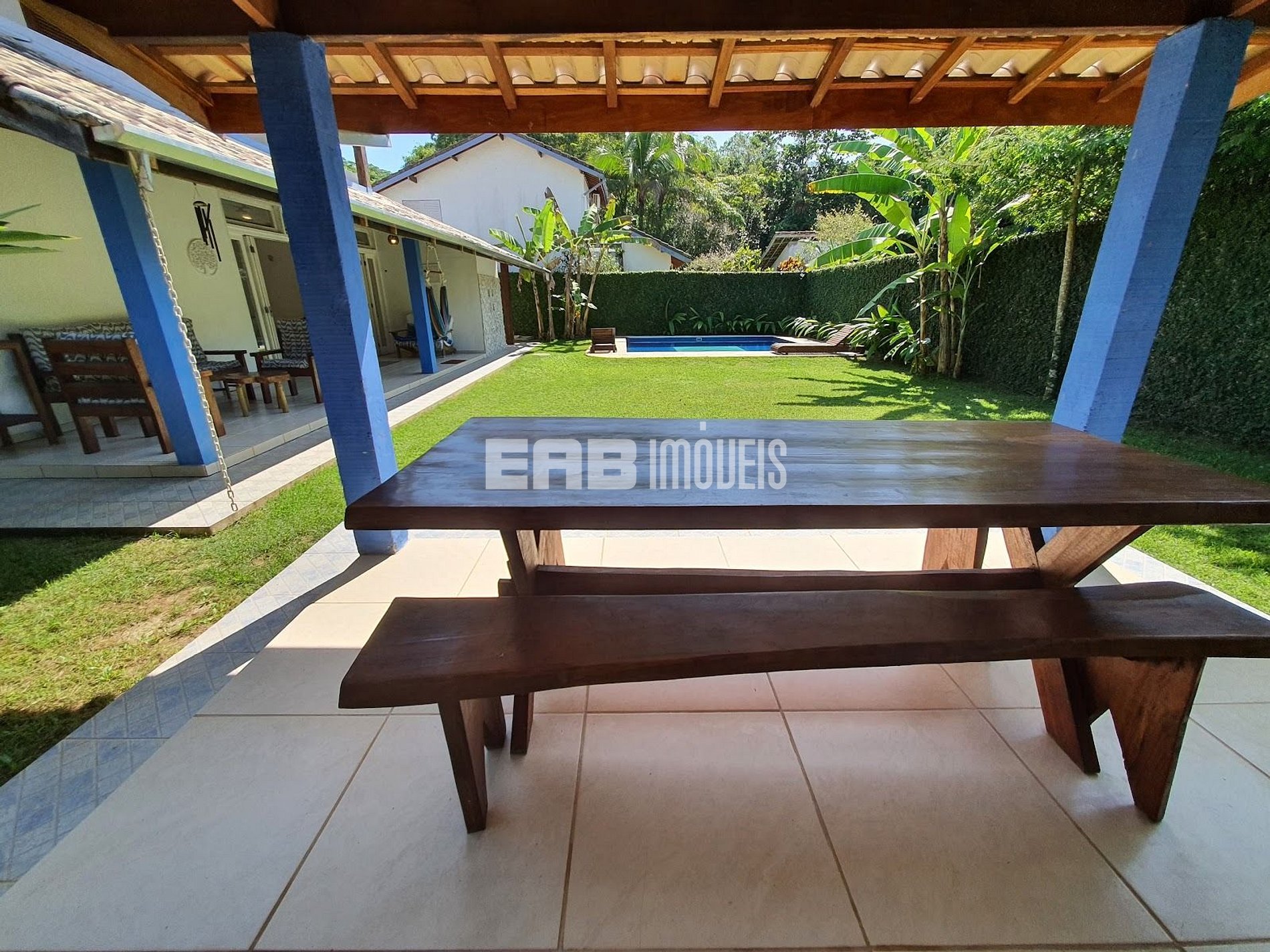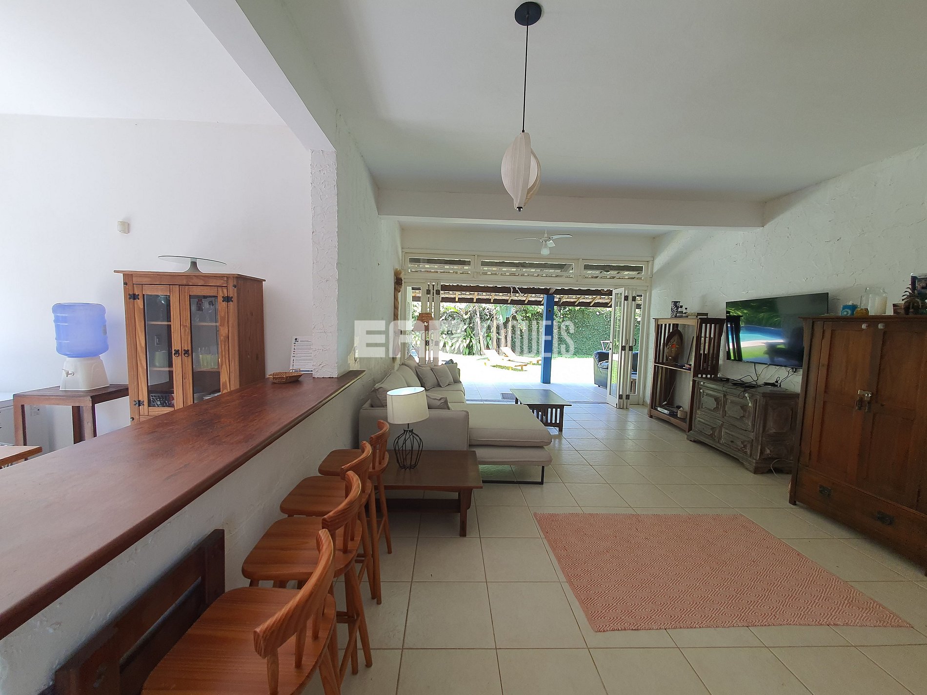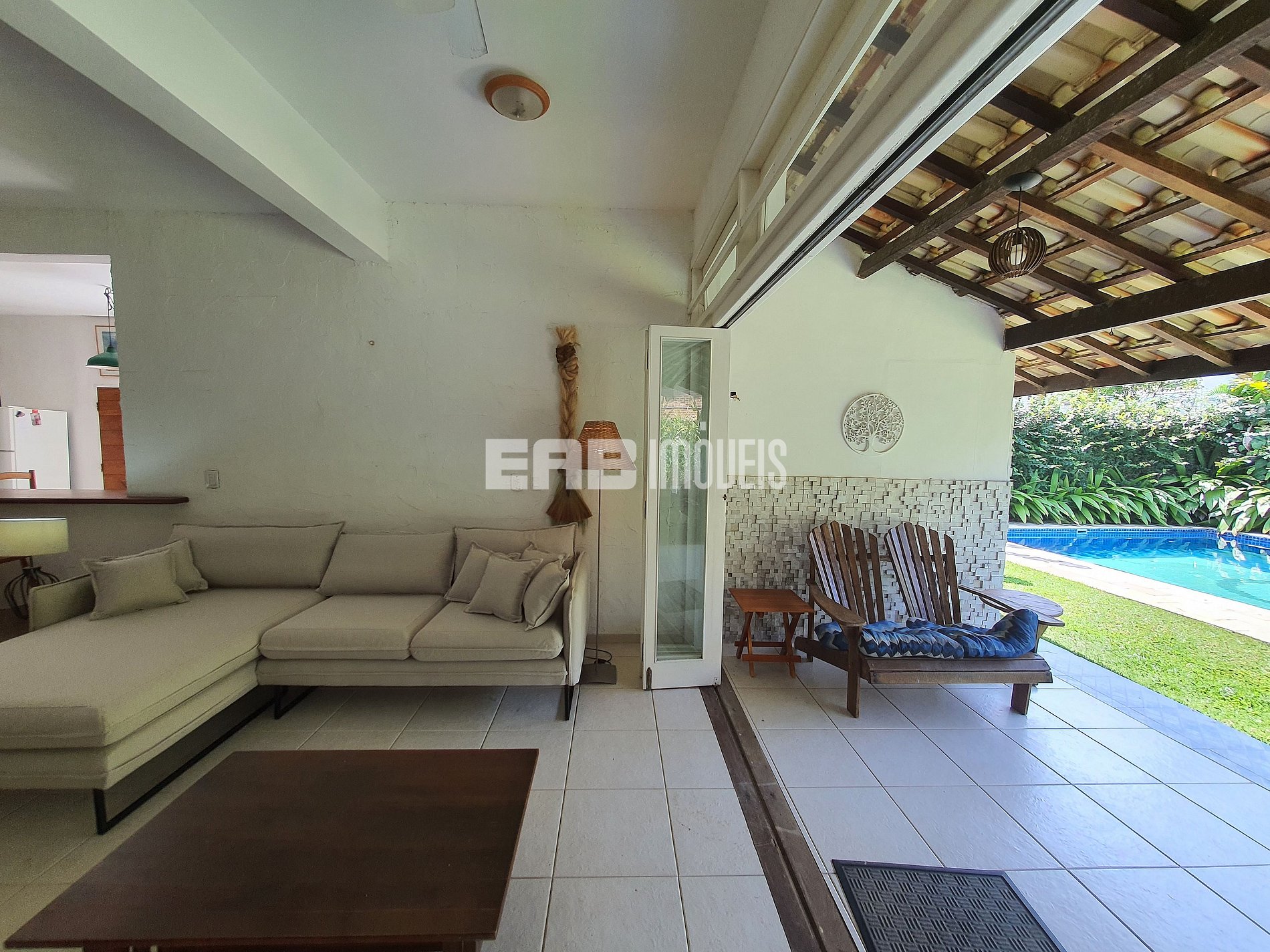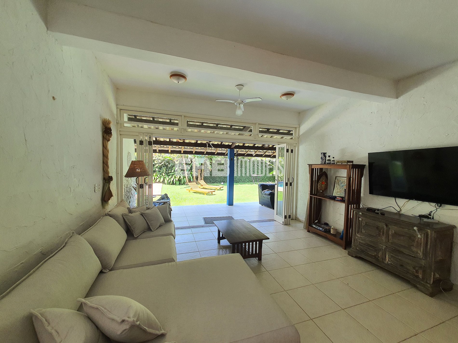 Agradável casa de praia, com cozinha integrada à sala, que se abre para a varanda voltada para um belo gramado com piscina e quiosque gourmet.
