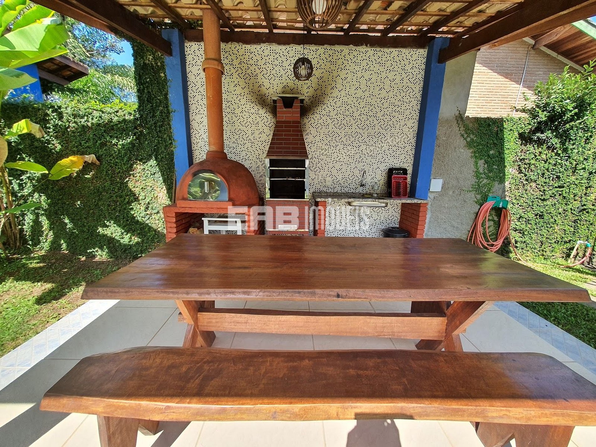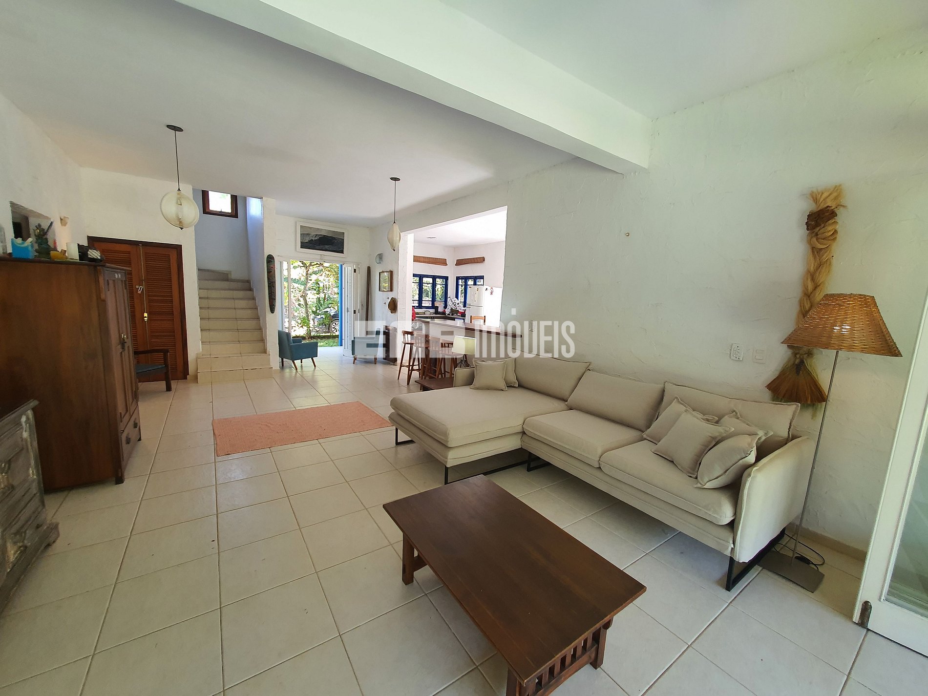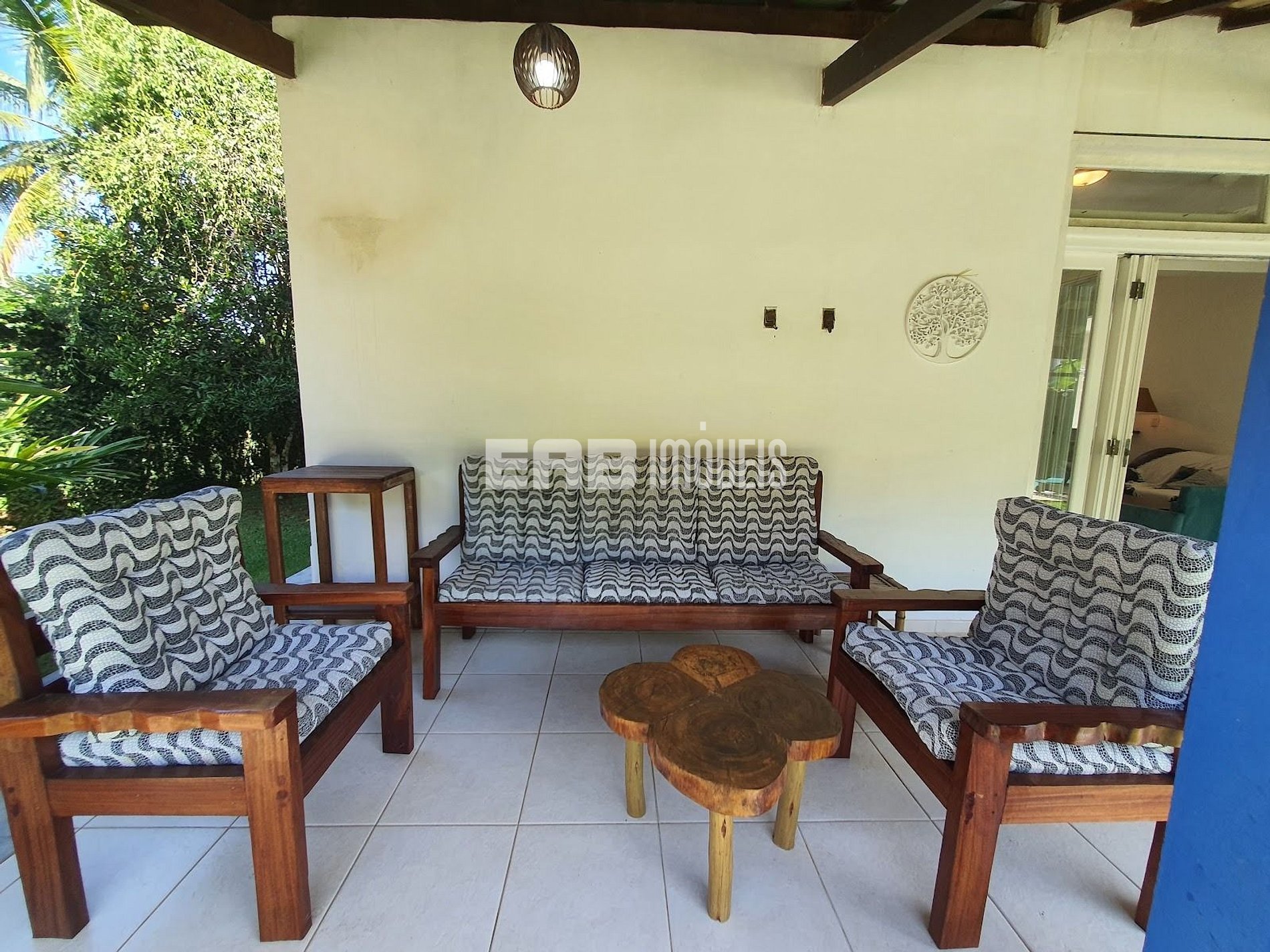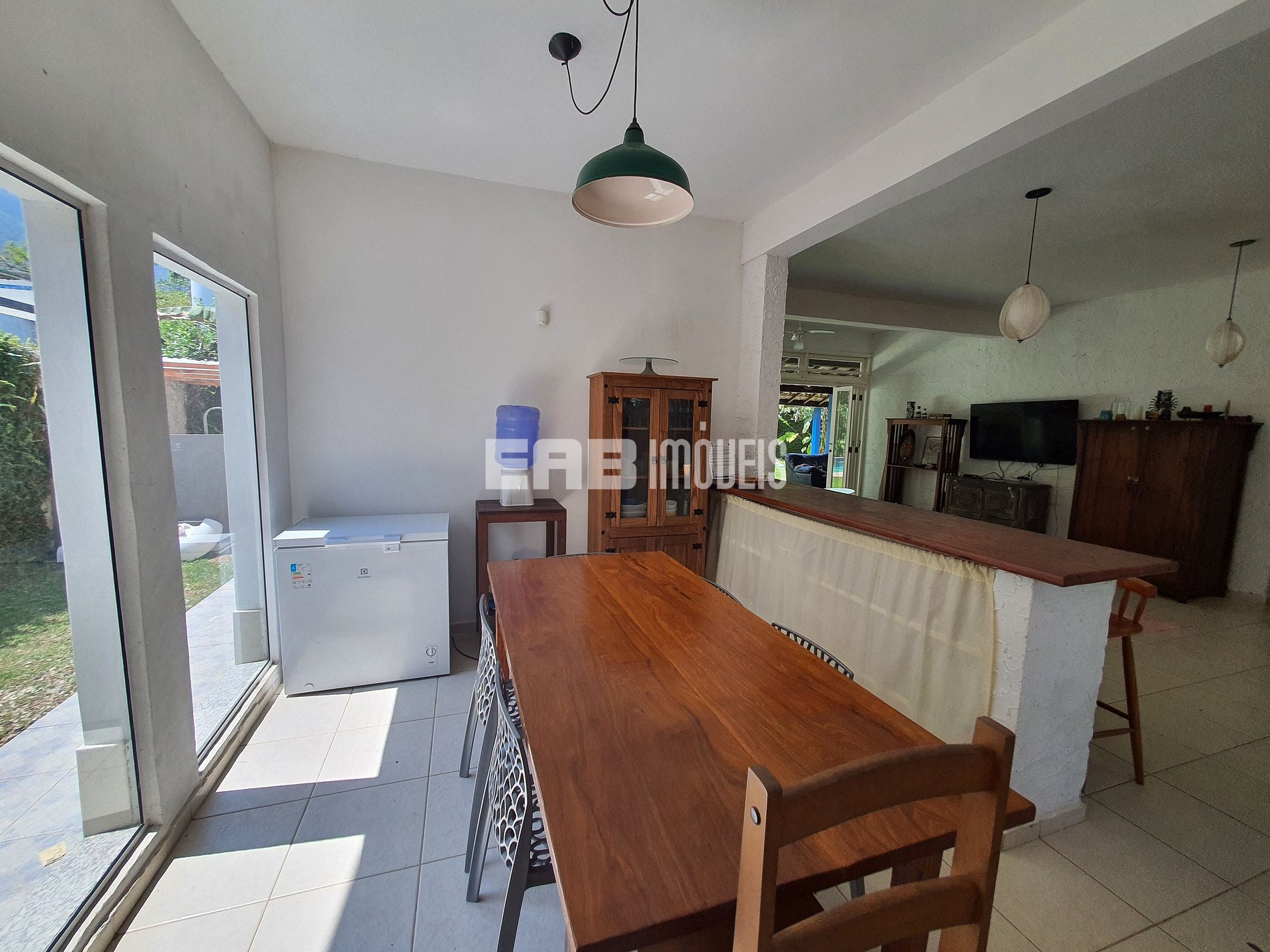 Agradável casa de praia, com cozinha integrada à sala, que se abre para a varanda voltada para um belo gramado com piscina e quiosque gourmet.