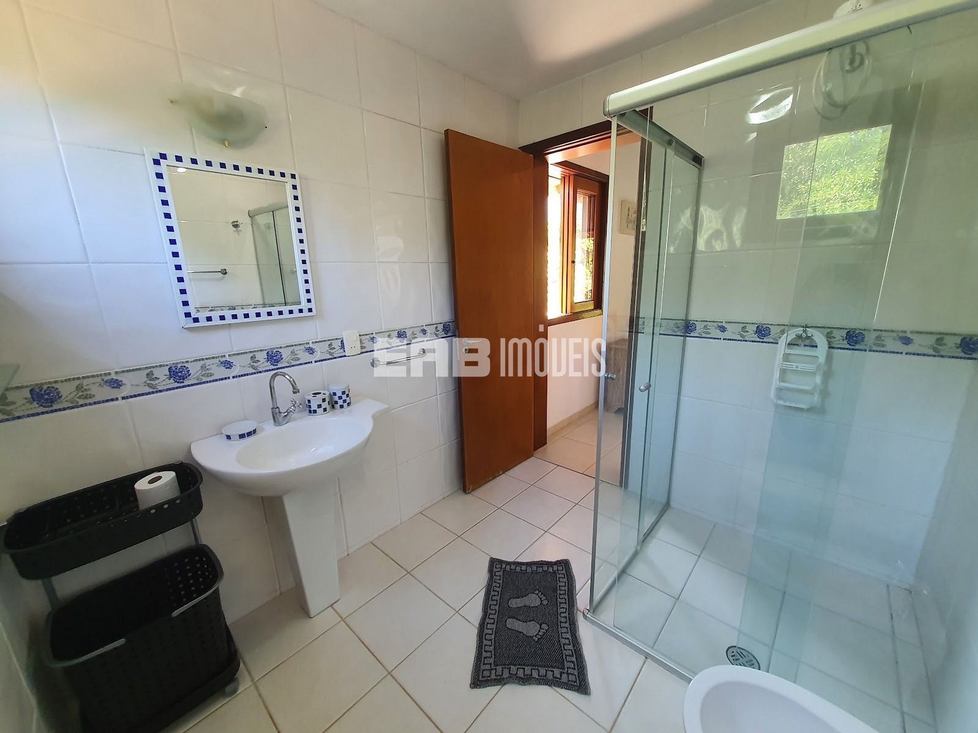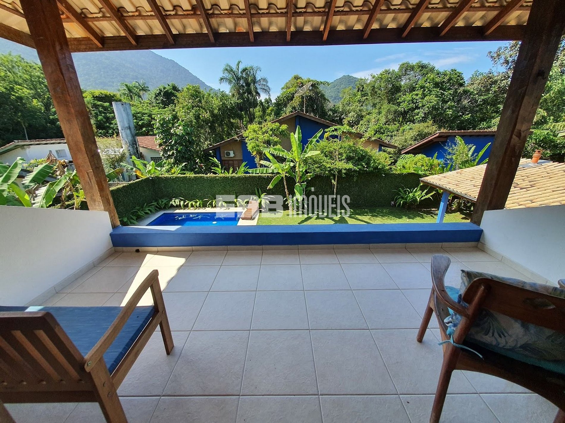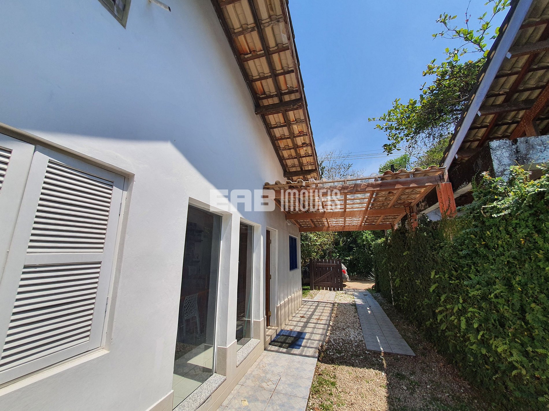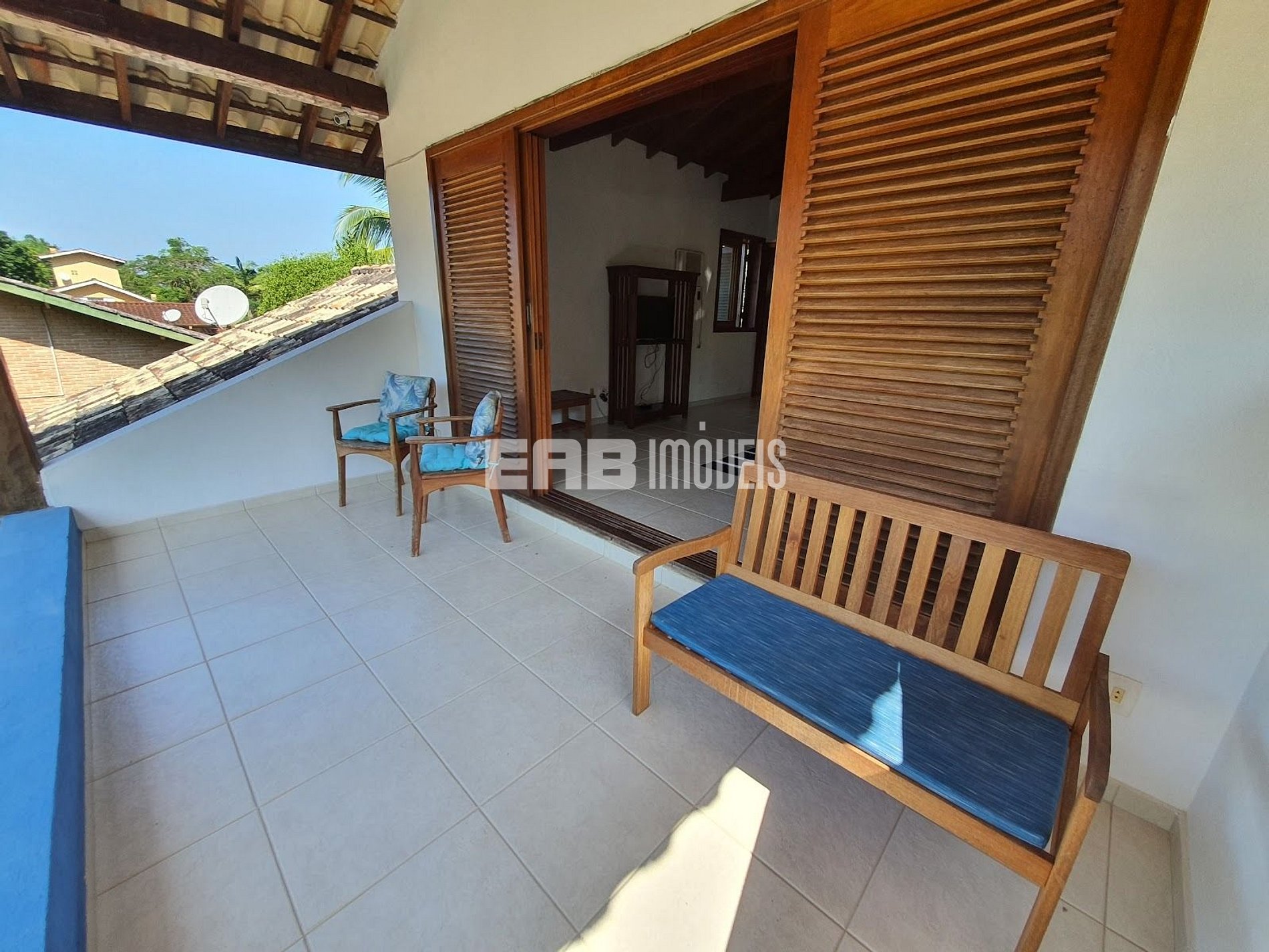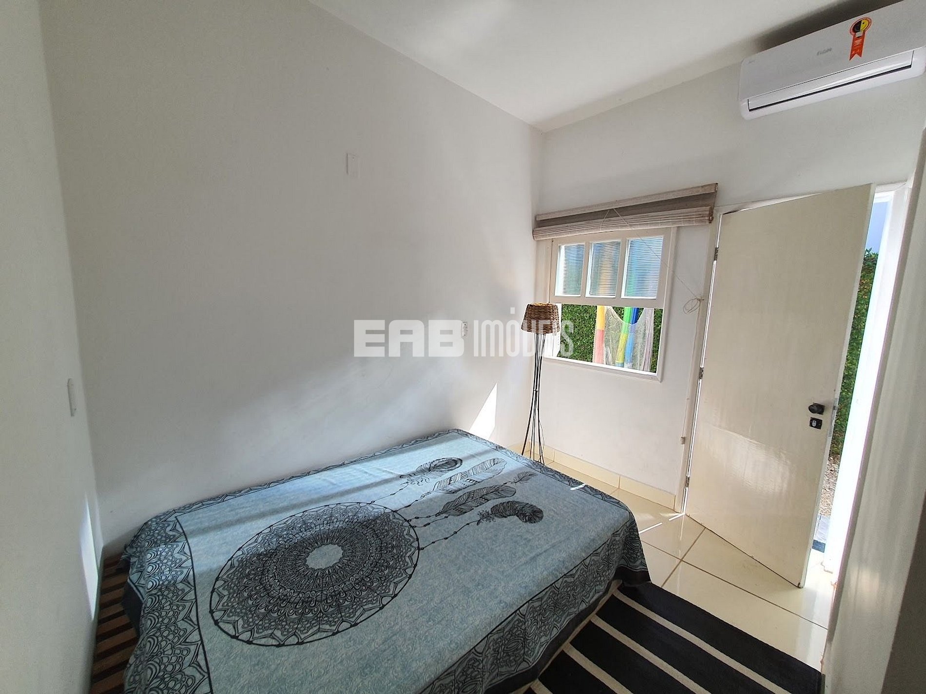 Agradável casa de praia, com cozinha integrada à sala, que se abre para a varanda voltada para um belo gramado com piscina e quiosque gourmet.