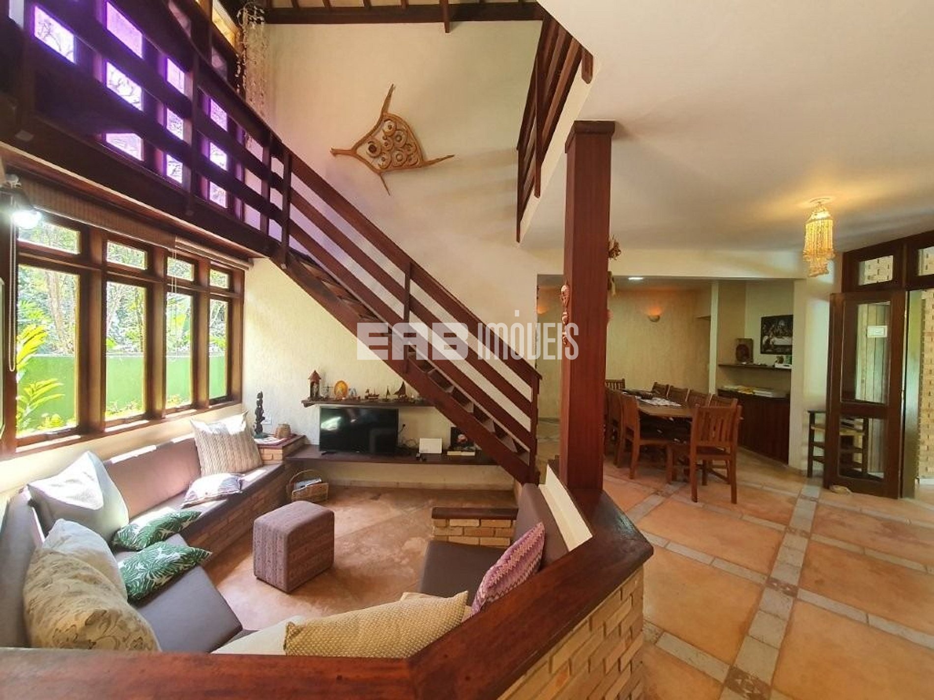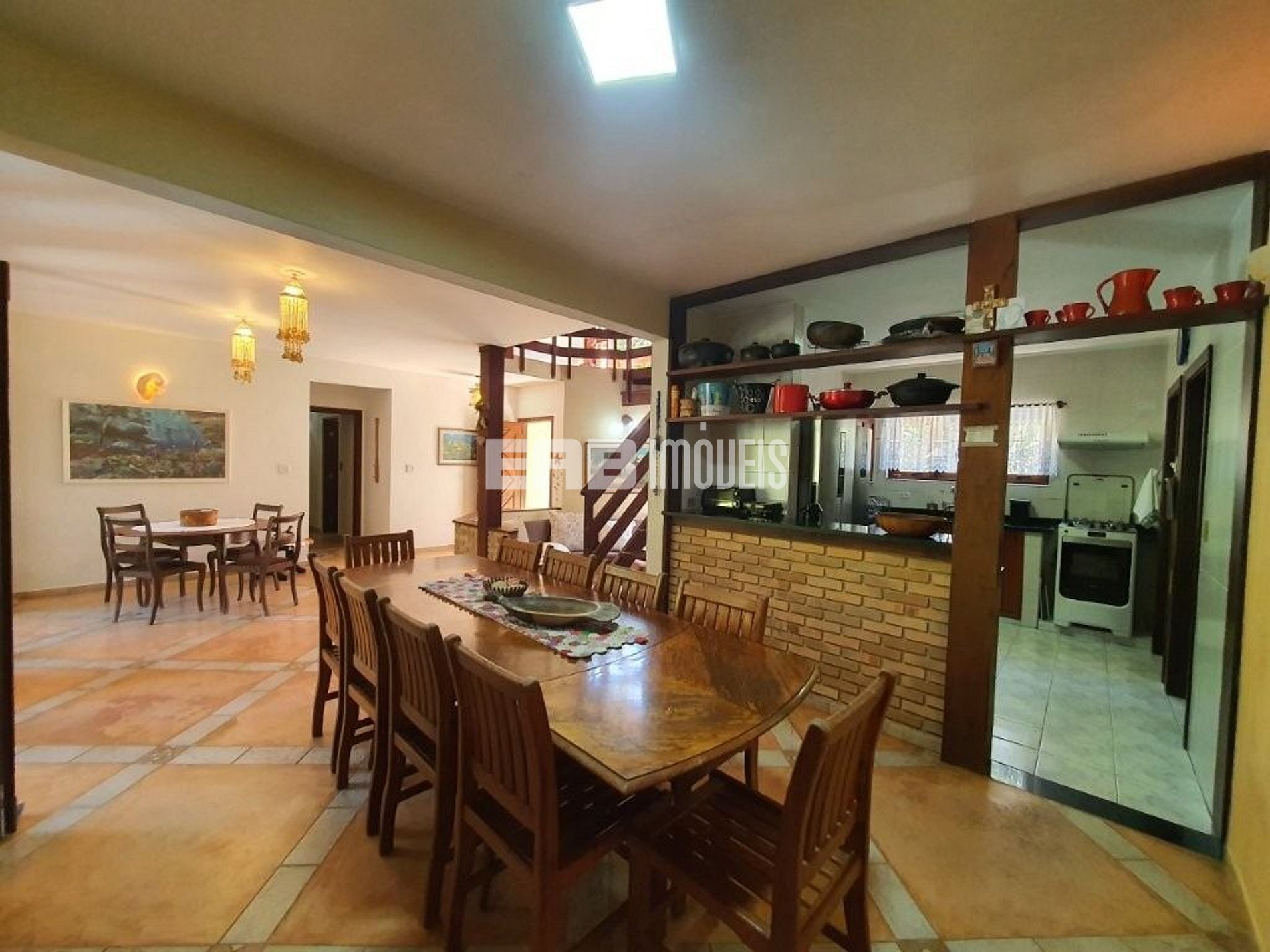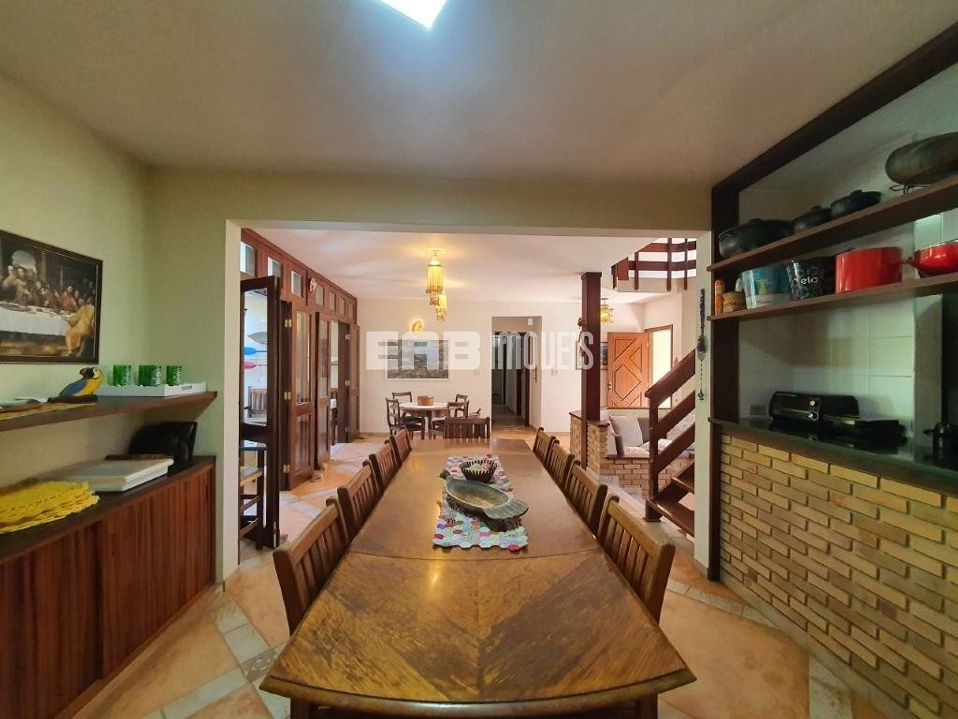 Casa com cinco dormitórios, sendo 1 suíte e 2 suítes americanas, piscina, área gourmet com churrasqueira e forno de pizza, mezanino com mesas de bilhar e ping-pong, além de um agradável e colorido jardim.