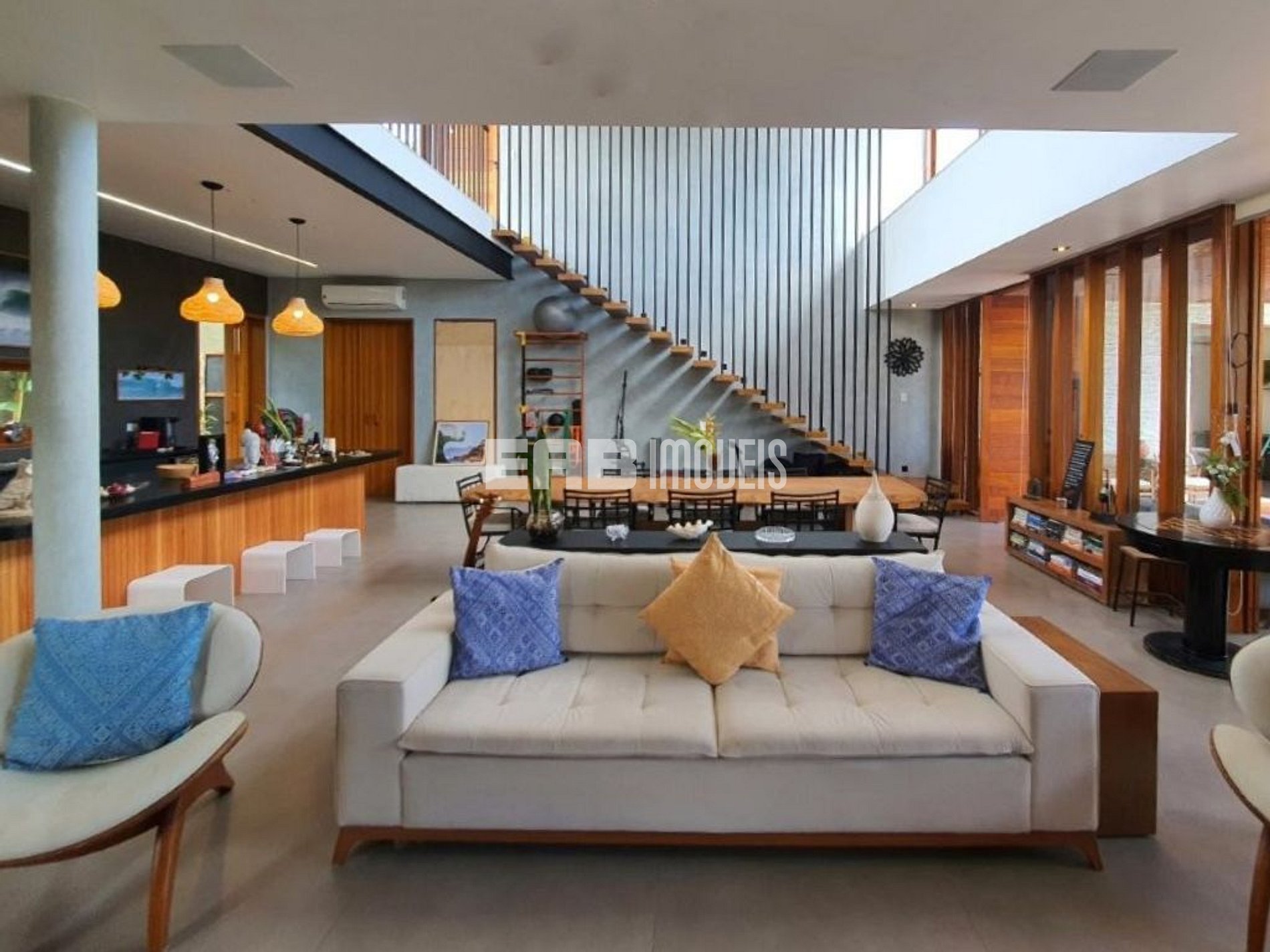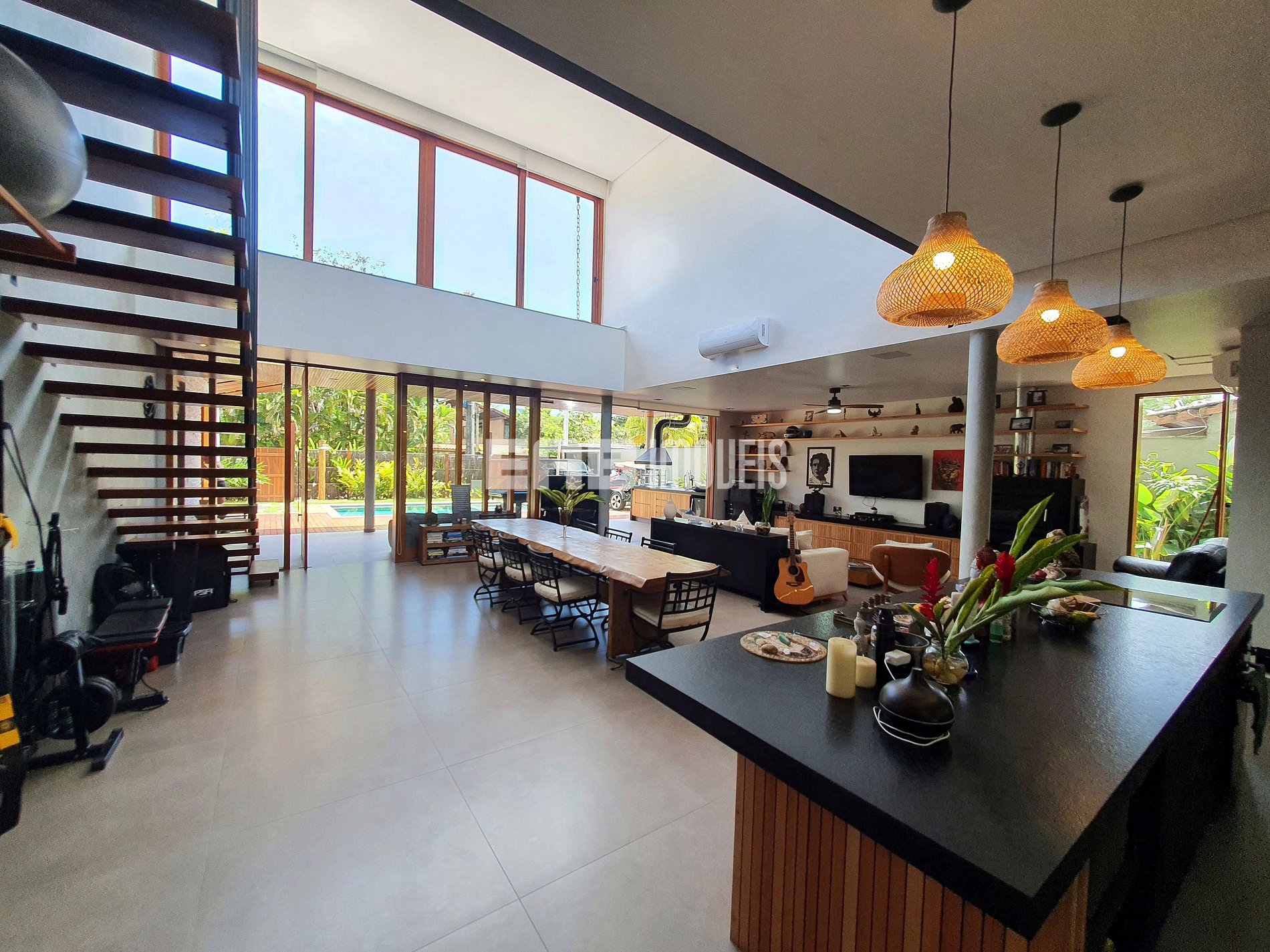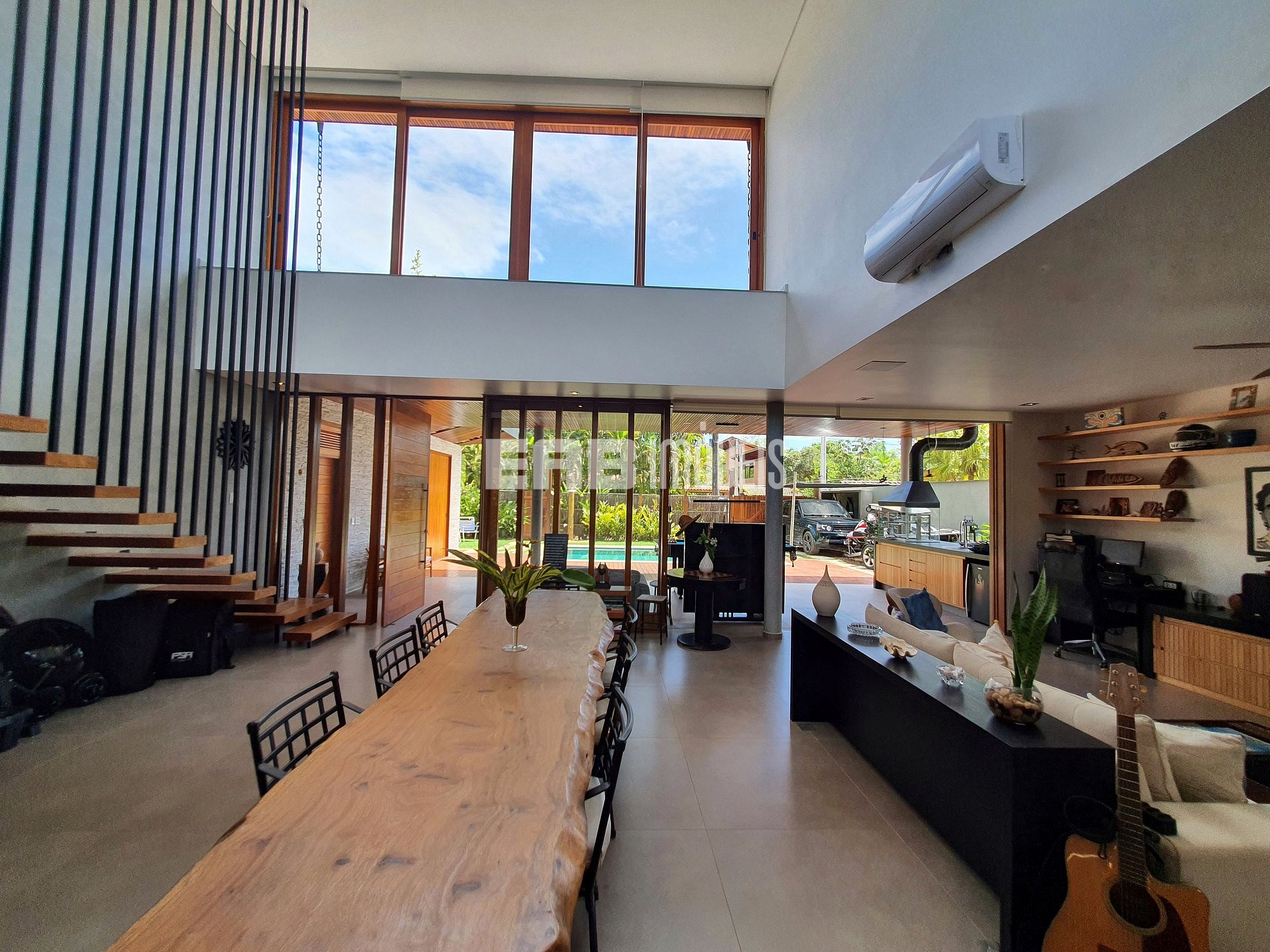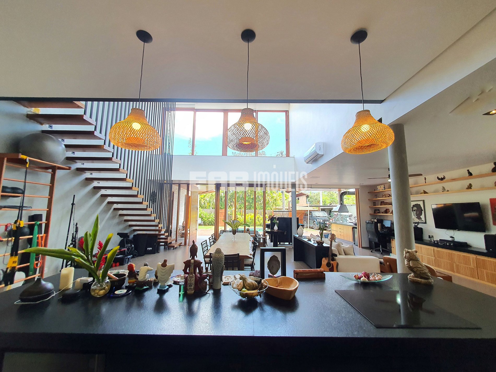 Com arquitetura contemporânea e integração total entre os ambientes, a casa tem um amplo living com pé-direito duplo, iluminação natural abundante e um design que mescla madeira nobre e acabamentos modernos. A área social é o coração do imóvel: sala de estar elegante, cozinha gourmet totalmente equipada e uma generosa mesa de jantar, ideal para longos almoços e jantares memoráveis.