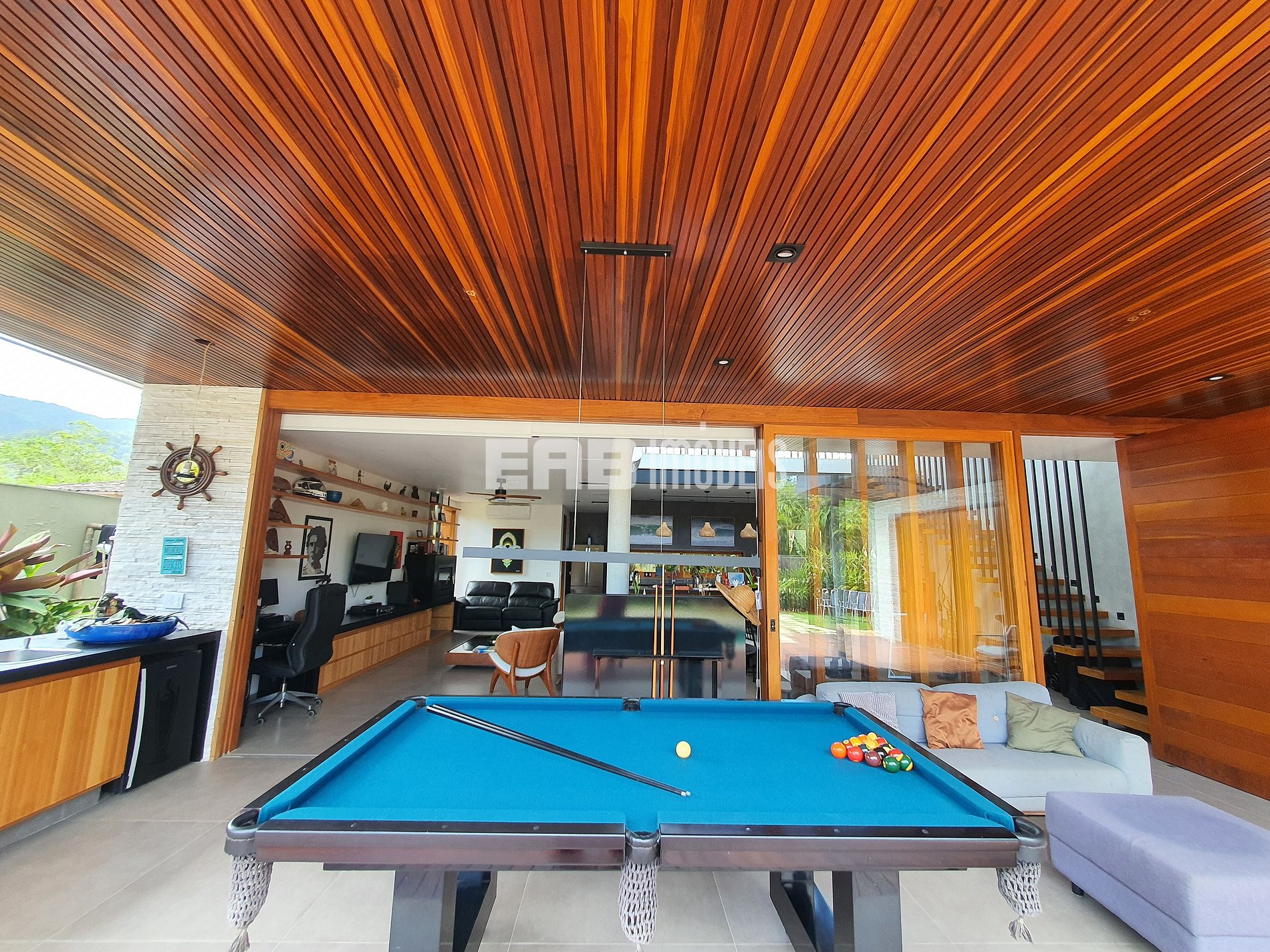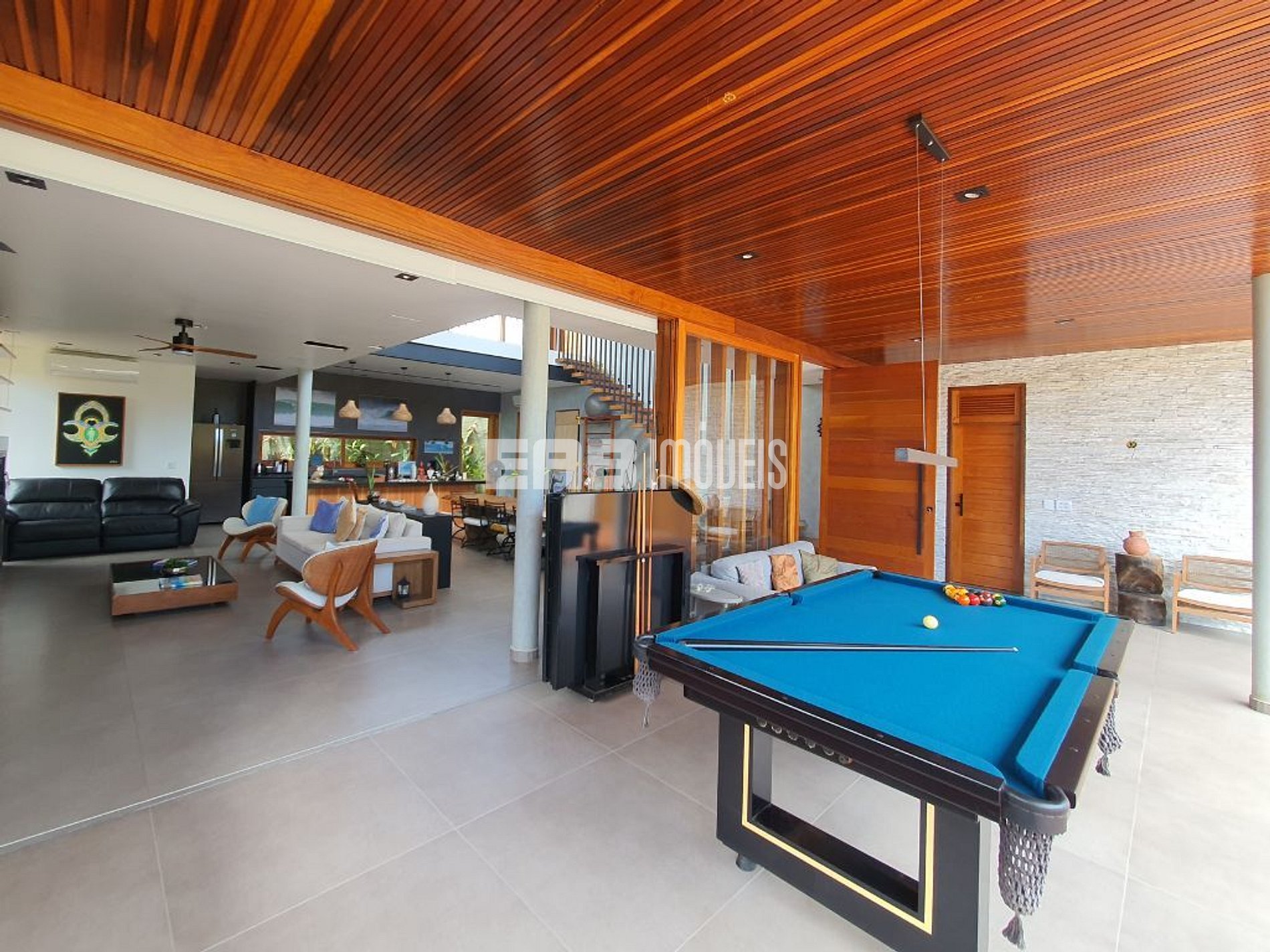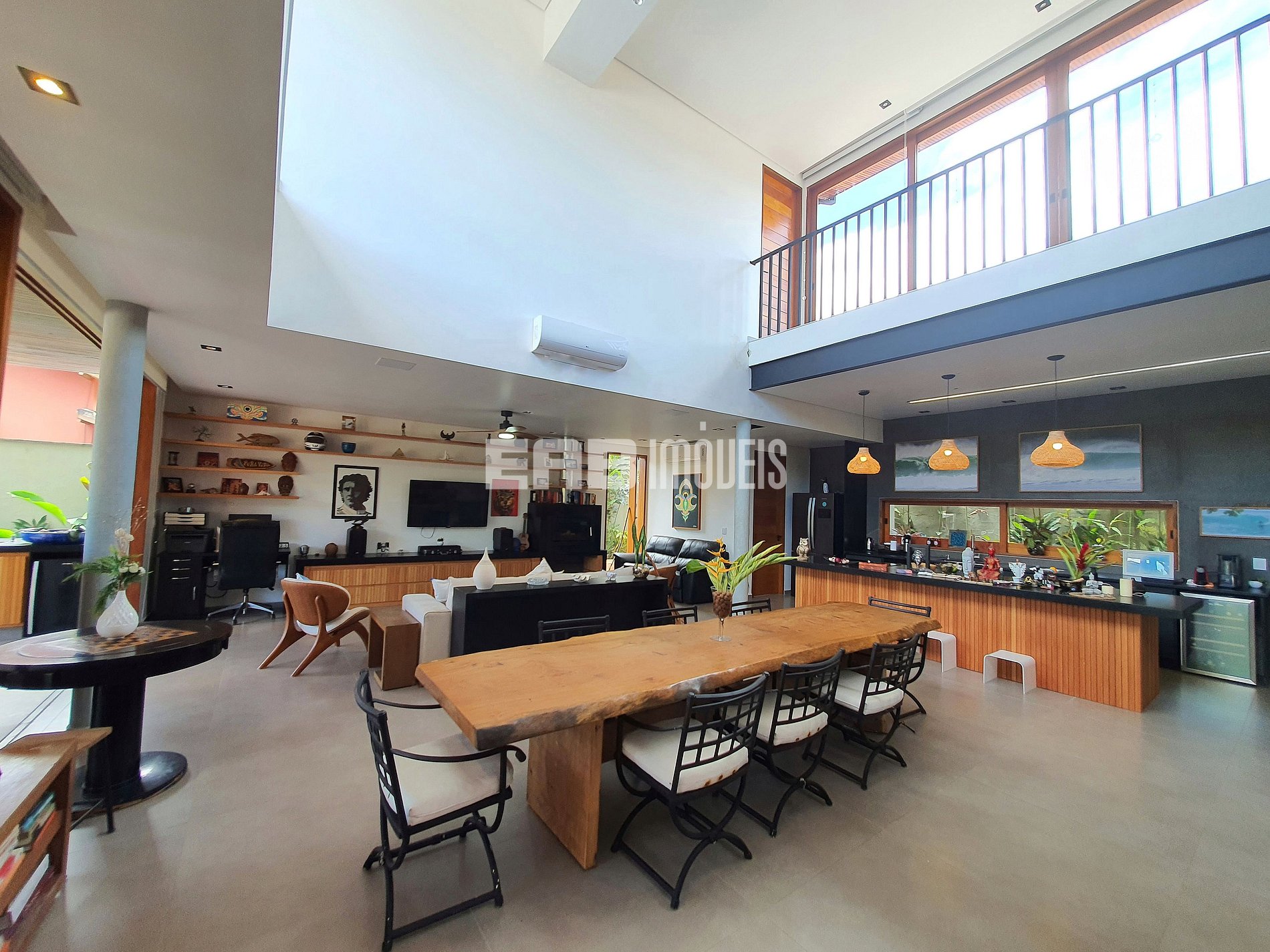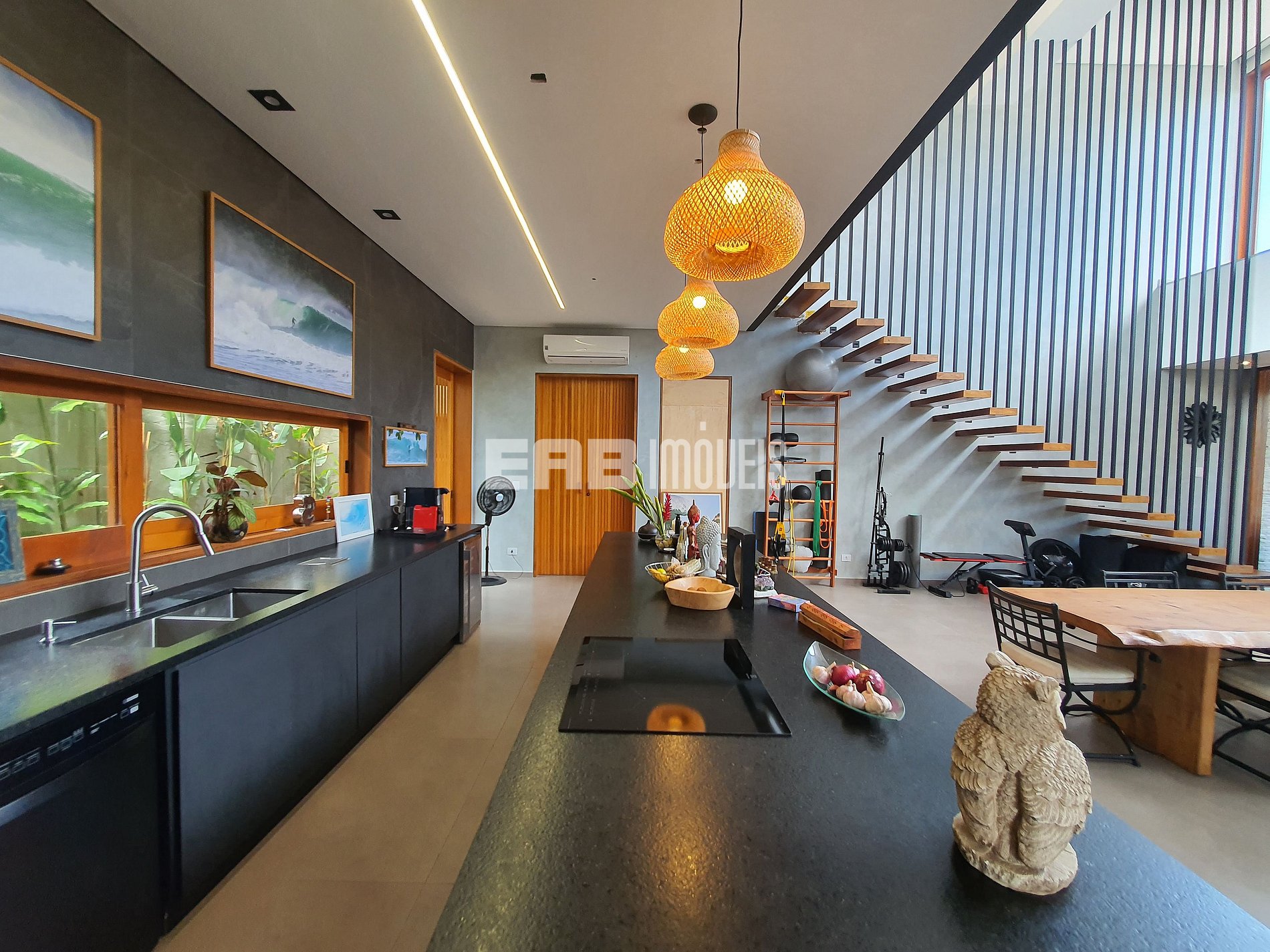 Com arquitetura contemporânea e integração total entre os ambientes, a casa tem um amplo living com pé-direito duplo, iluminação natural abundante e um design que mescla madeira nobre e acabamentos modernos. A área social é o coração do imóvel: sala de estar elegante, cozinha gourmet totalmente equipada e uma generosa mesa de jantar, ideal para longos almoços e jantares memoráveis.
