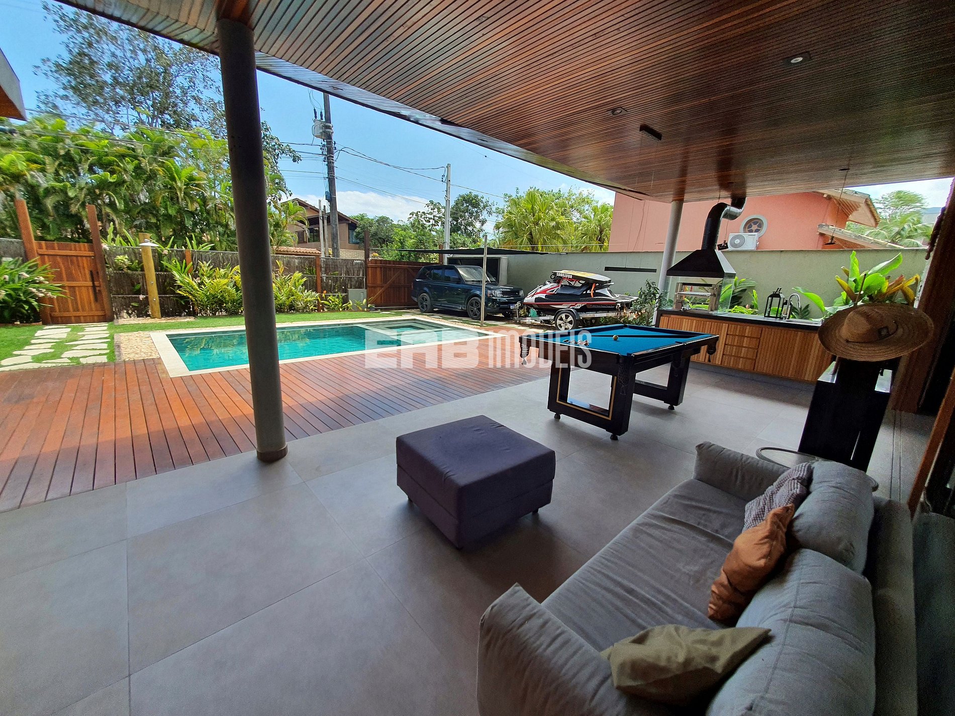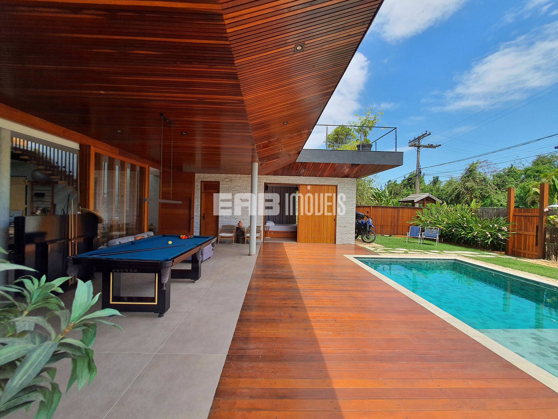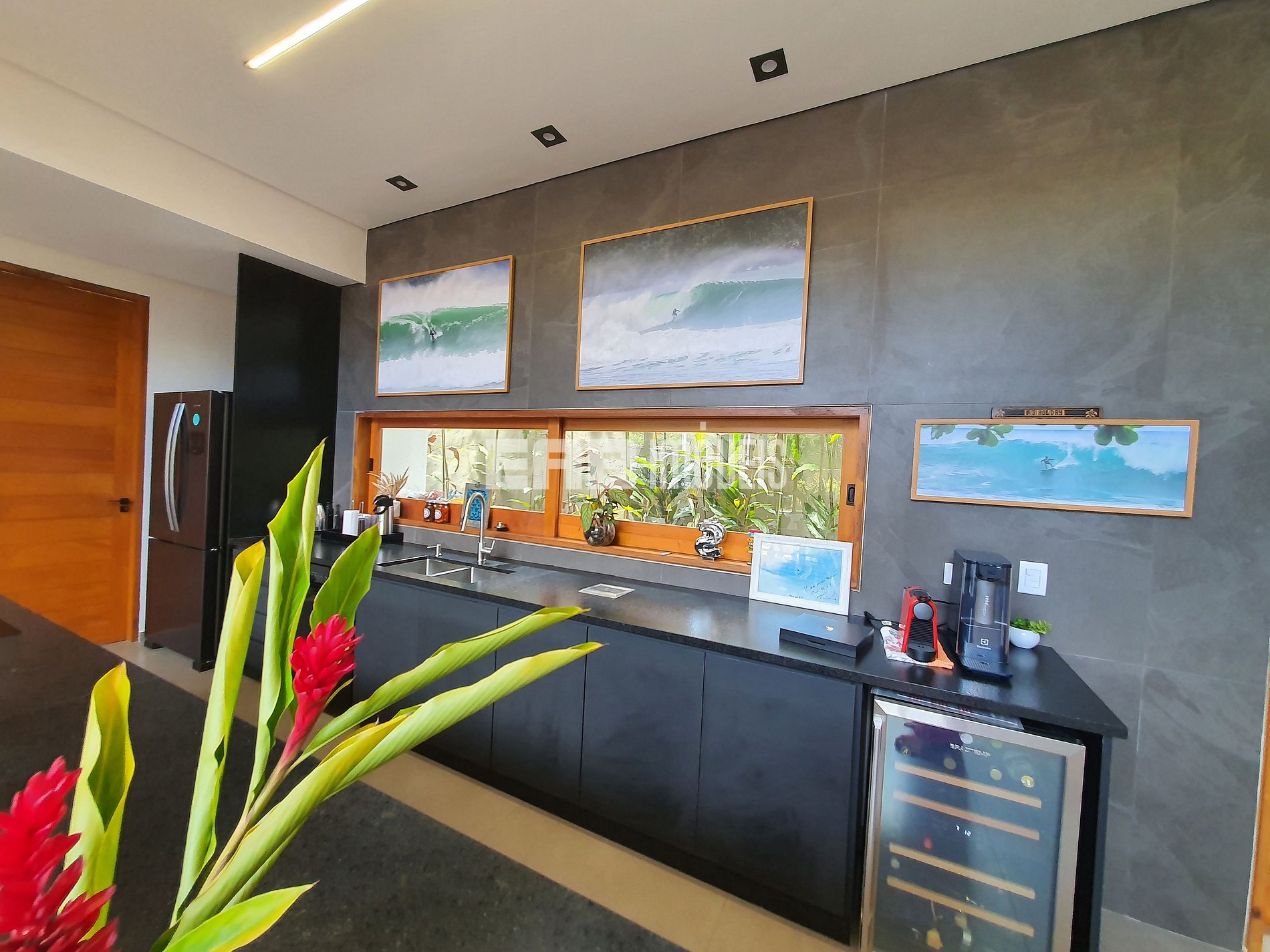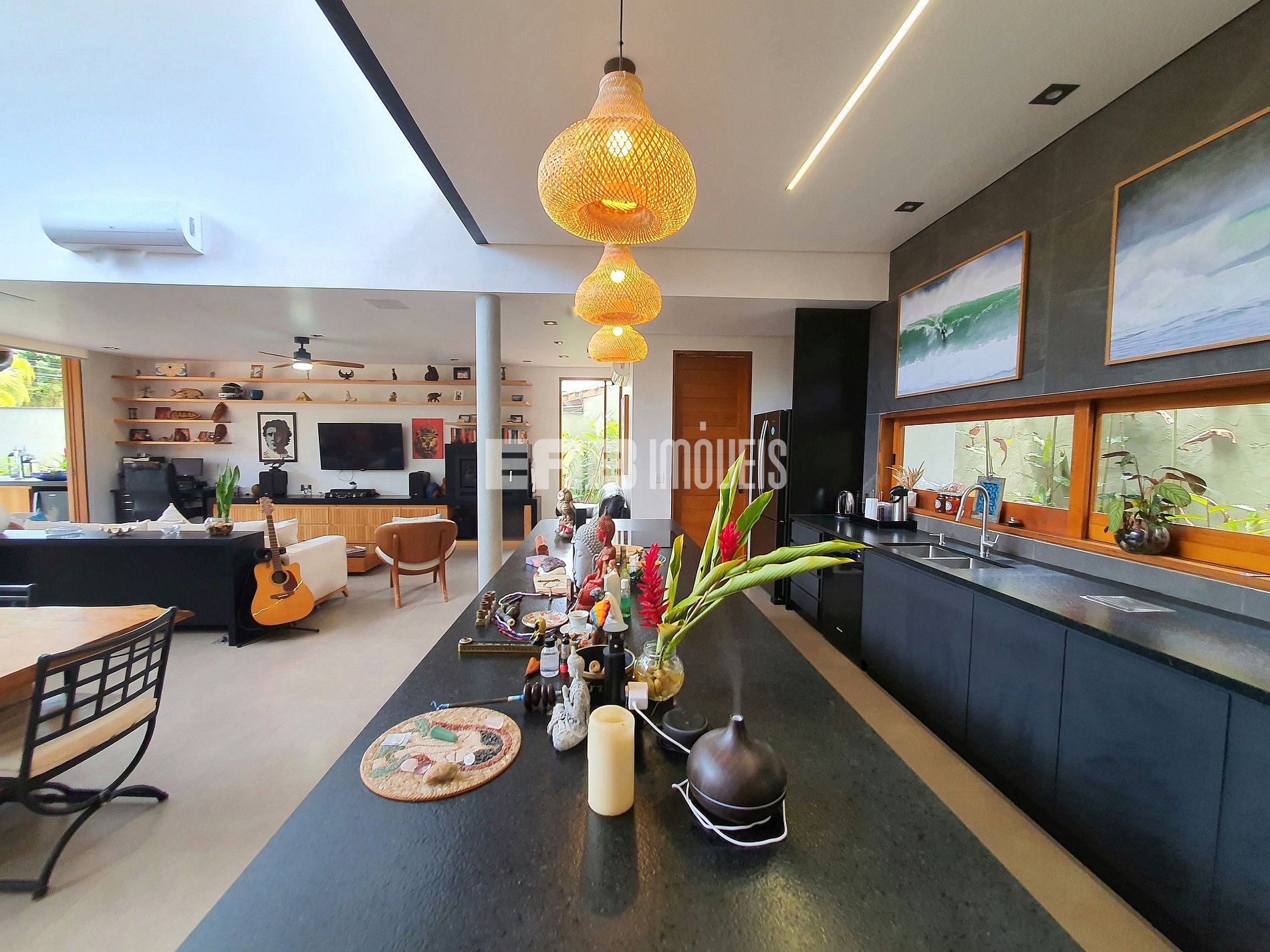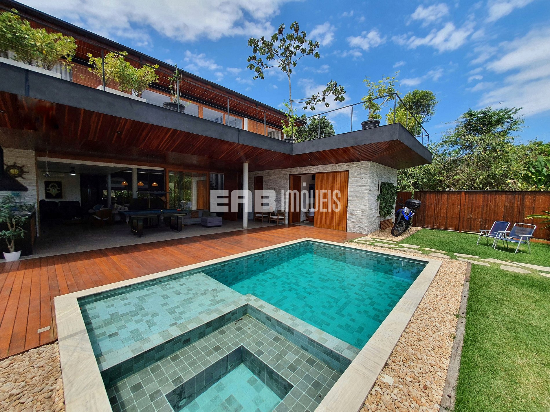 Com arquitetura contemporânea e integração total entre os ambientes, a casa tem um amplo living com pé-direito duplo, iluminação natural abundante e um design que mescla madeira nobre e acabamentos modernos. A área social é o coração do imóvel: sala de estar elegante, cozinha gourmet totalmente equipada e uma generosa mesa de jantar, ideal para longos almoços e jantares memoráveis.