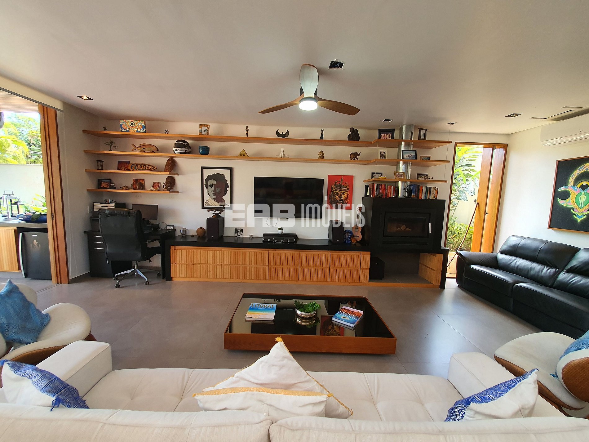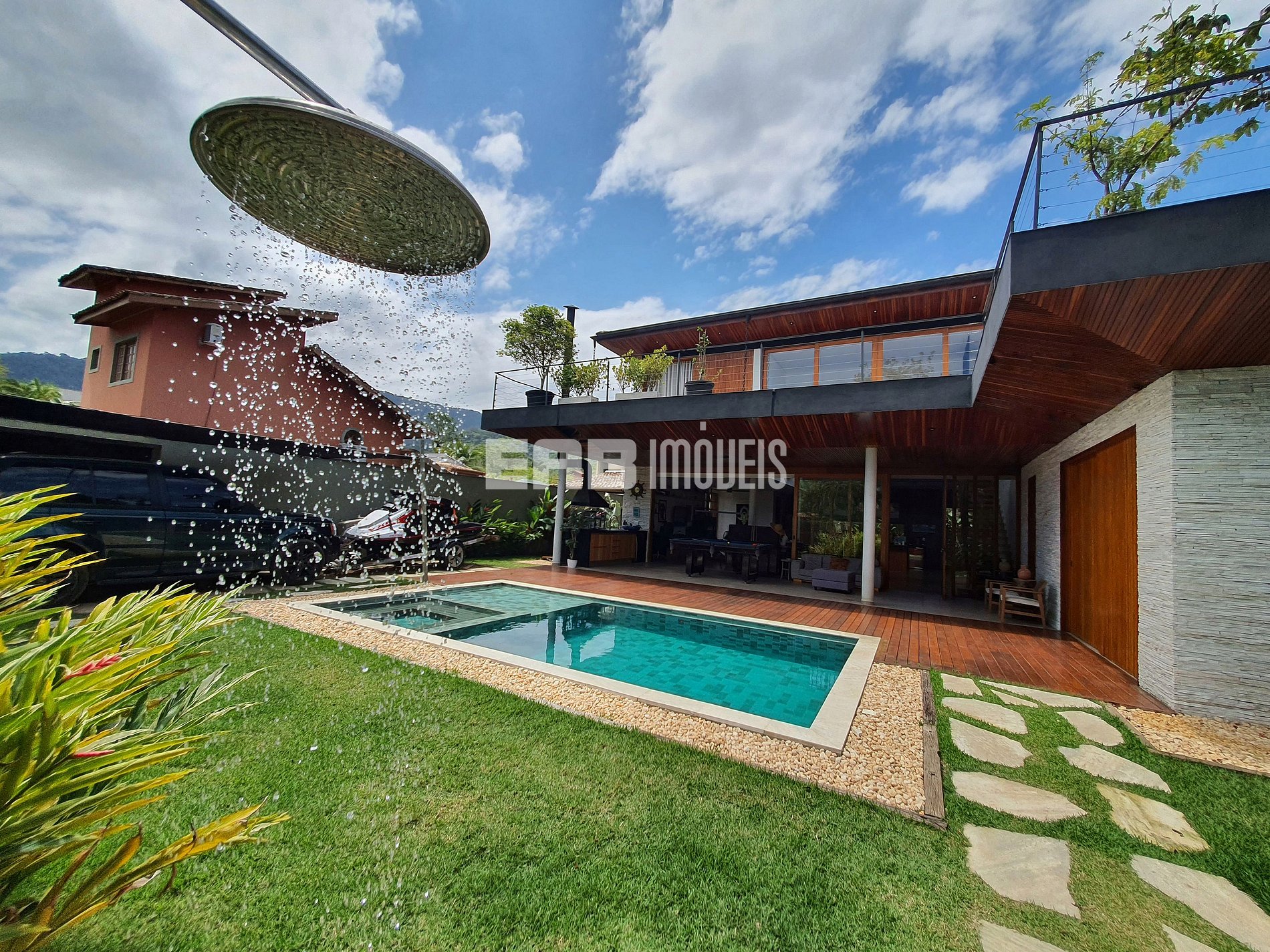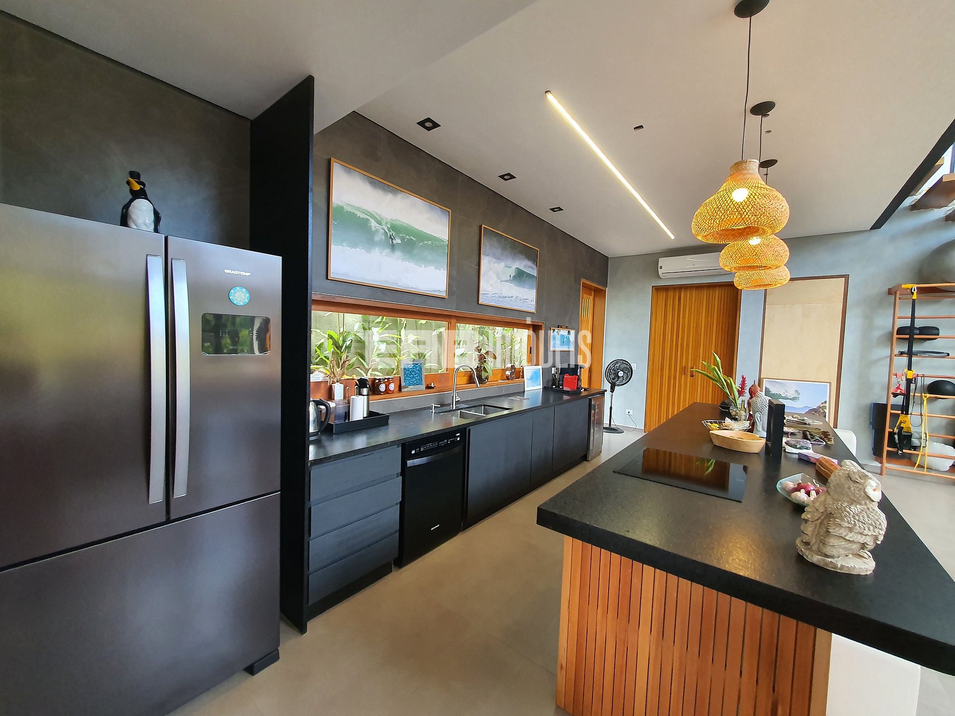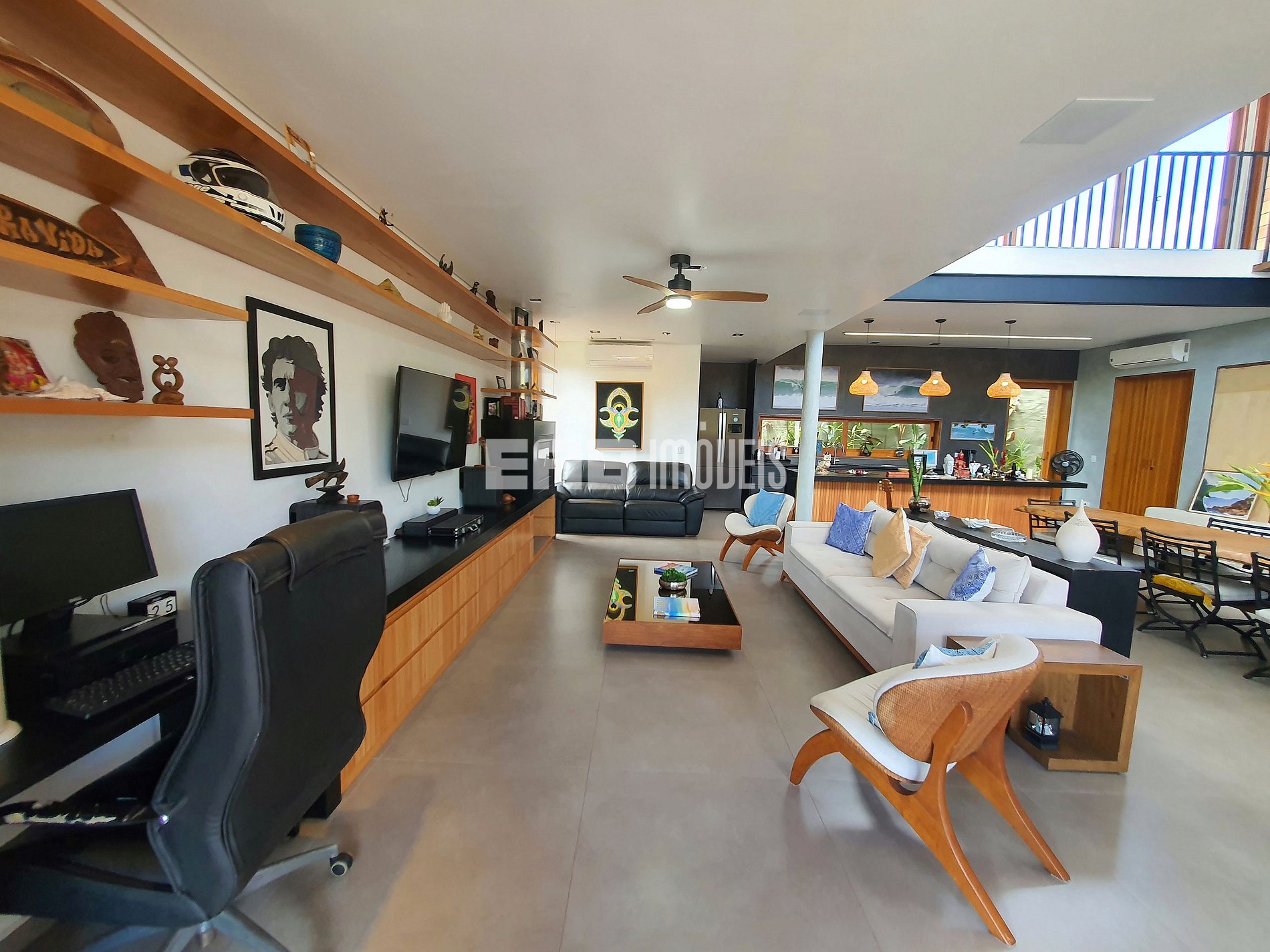Com arquitetura contemporânea e integração total entre os ambientes, a casa tem um amplo living com pé-direito duplo, iluminação natural abundante e um design que mescla madeira nobre e acabamentos modernos. A área social é o coração do imóvel: sala de estar elegante, cozinha gourmet totalmente equipada e uma generosa mesa de jantar, ideal para longos almoços e jantares memoráveis.