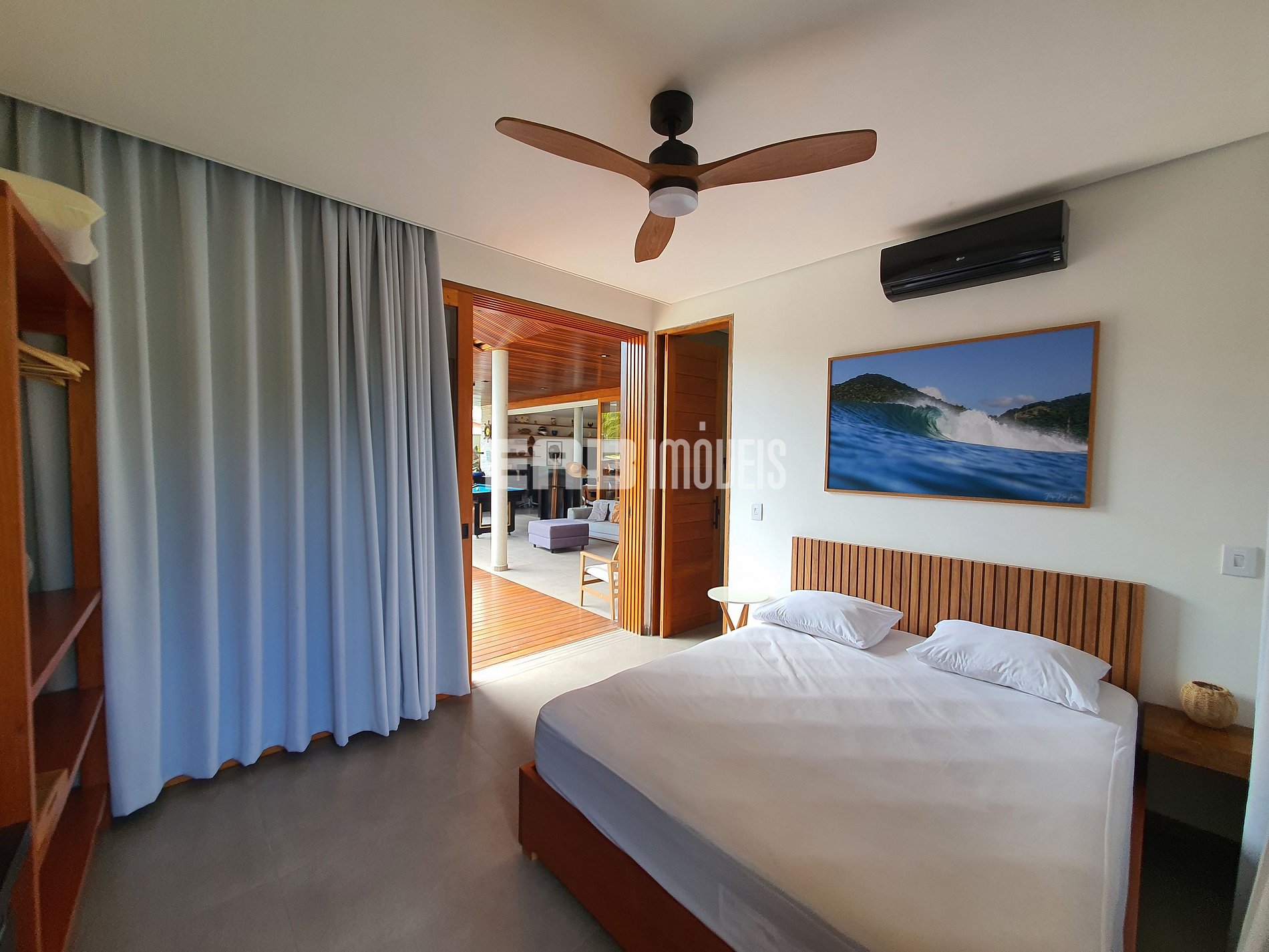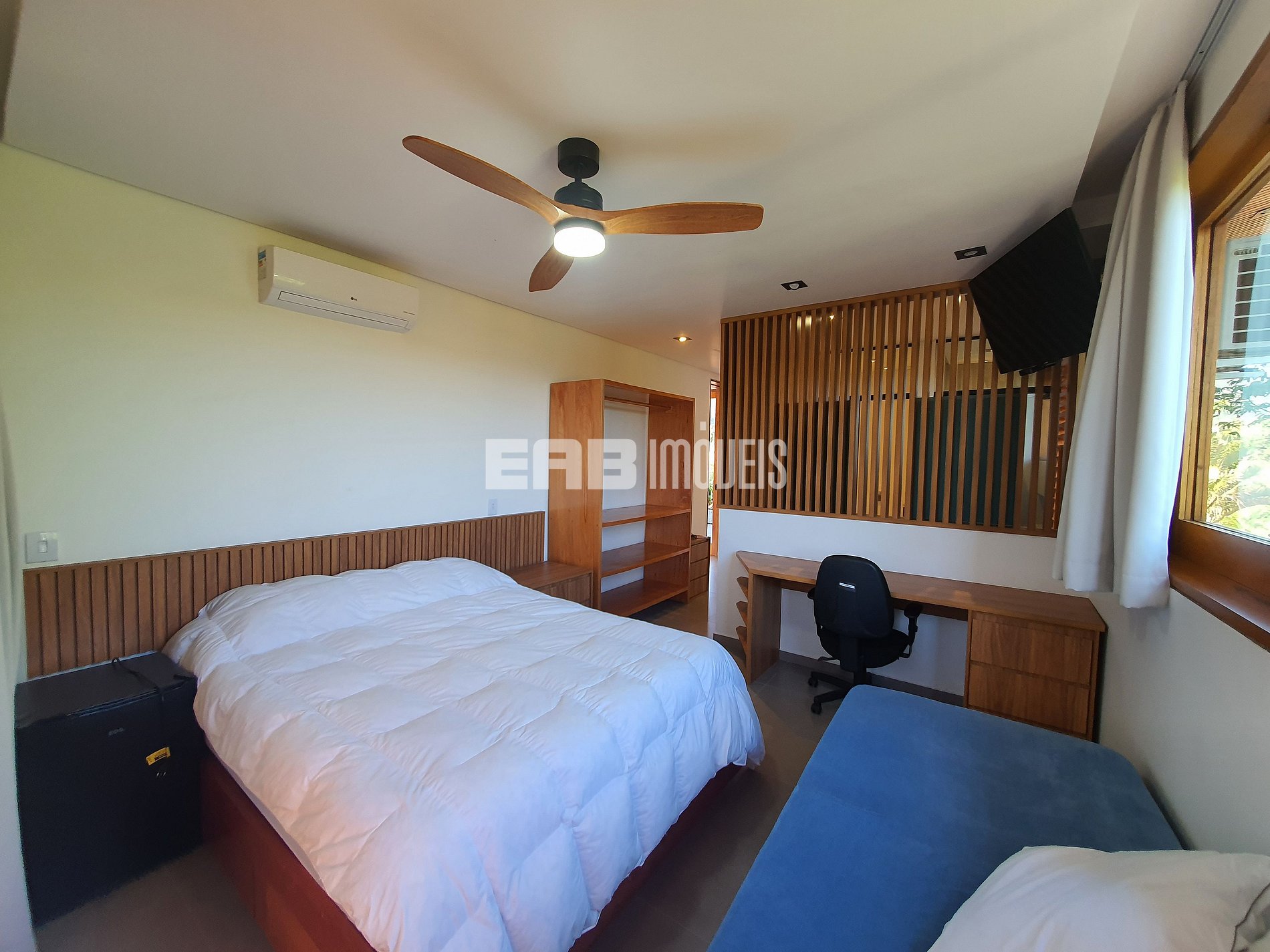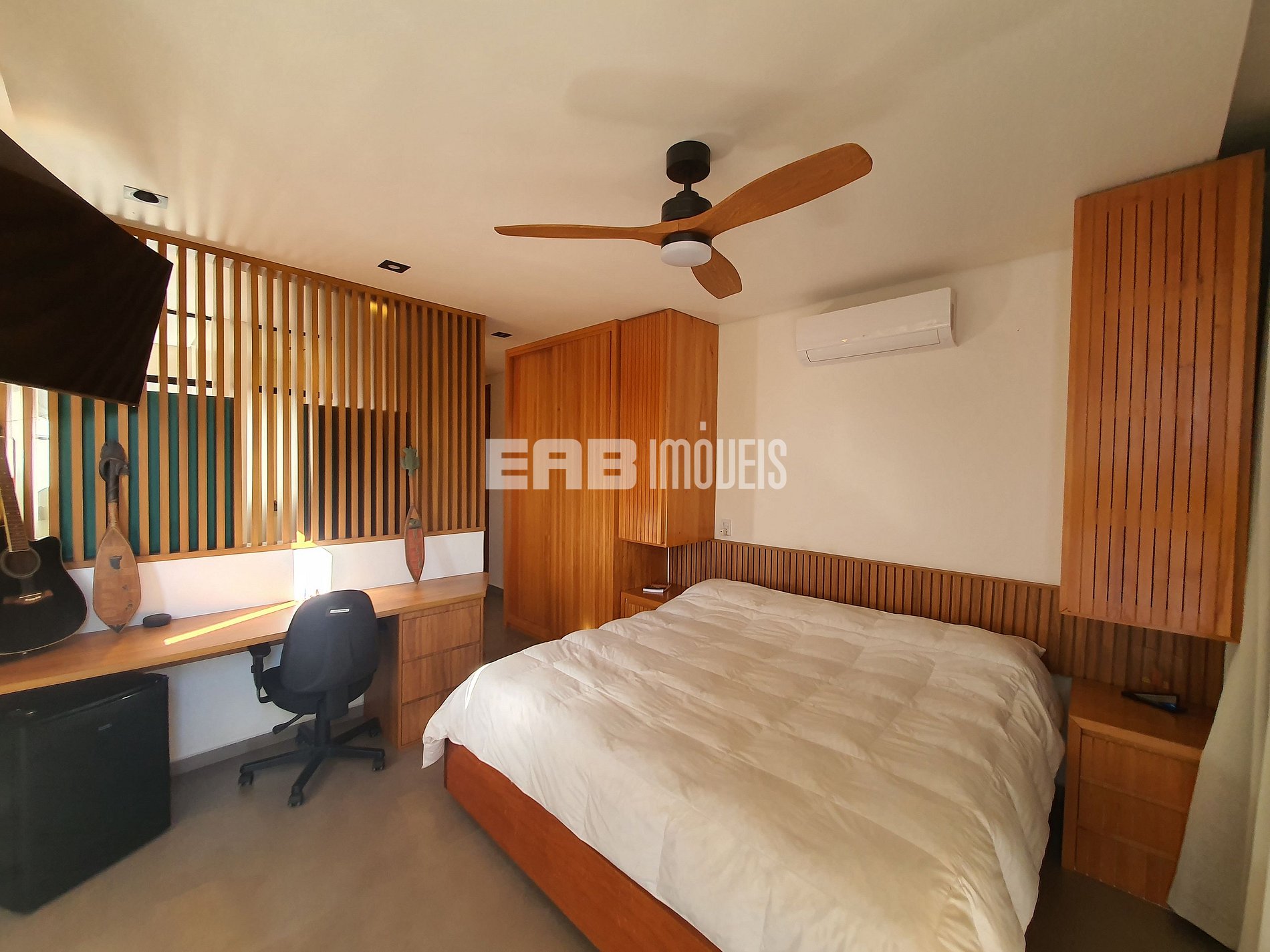 Quarto 1 (suíte): 1 cama de casal king, ventilador de teto, ar condicionado