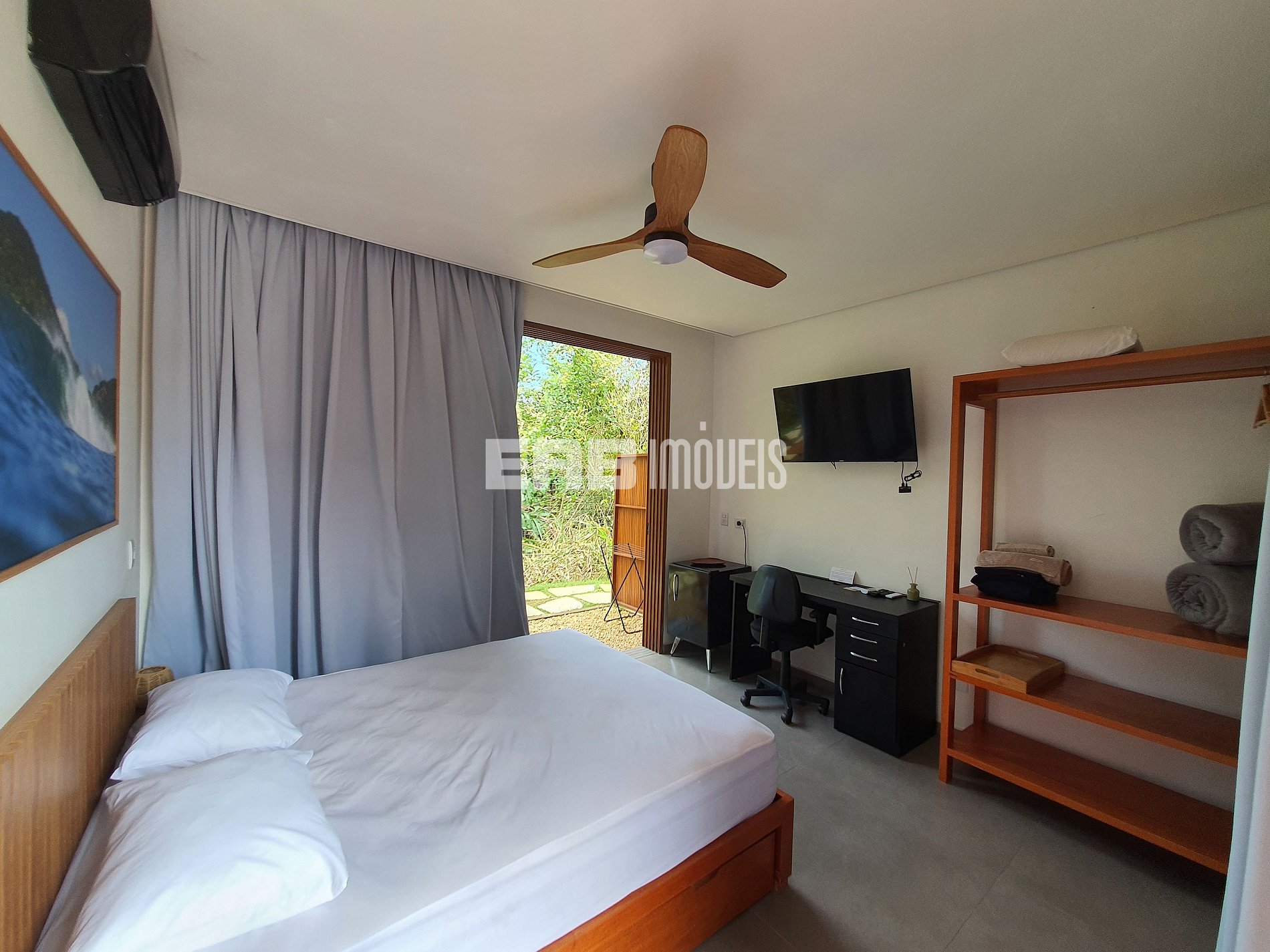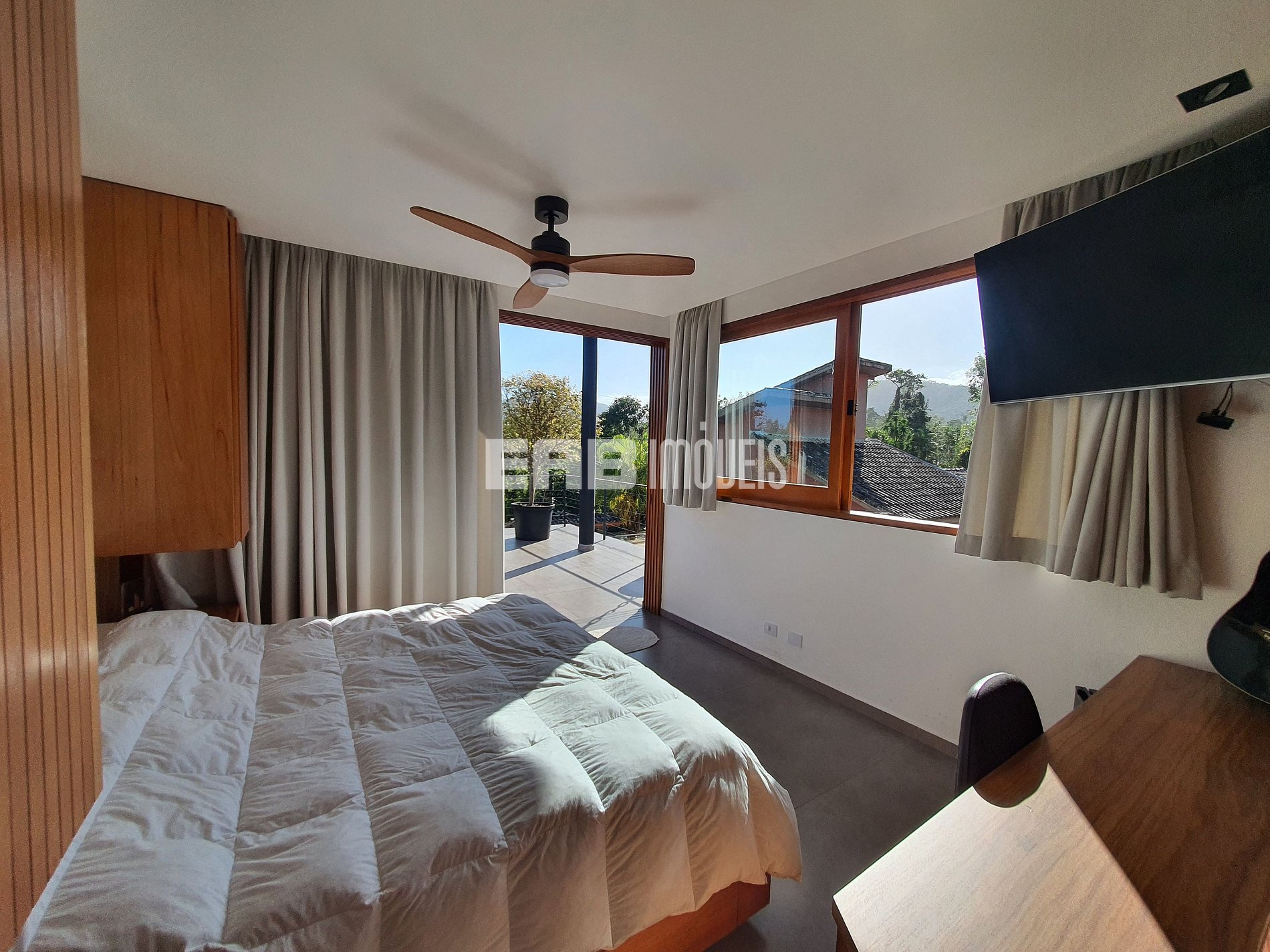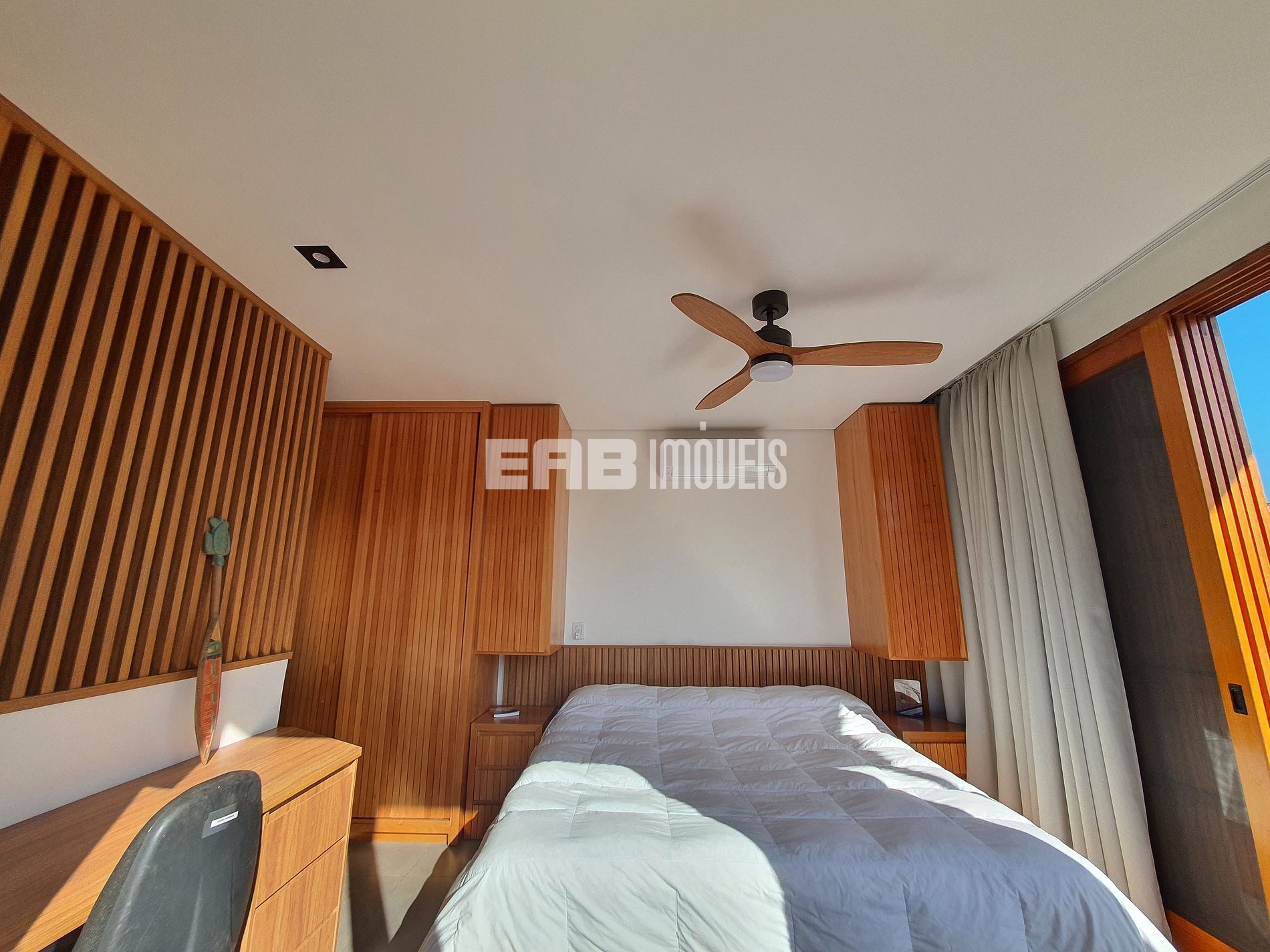 Quarto 1 (suíte): 1 cama de casal king, ventilador de teto, ar condicionado