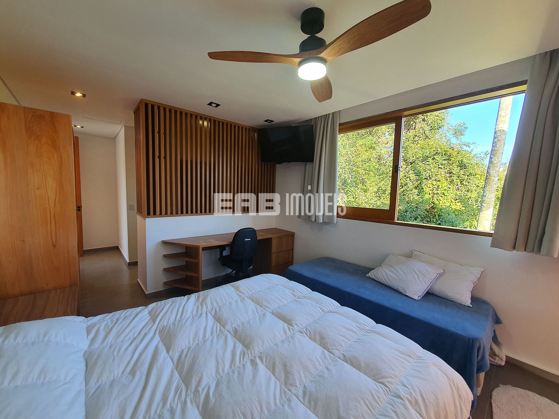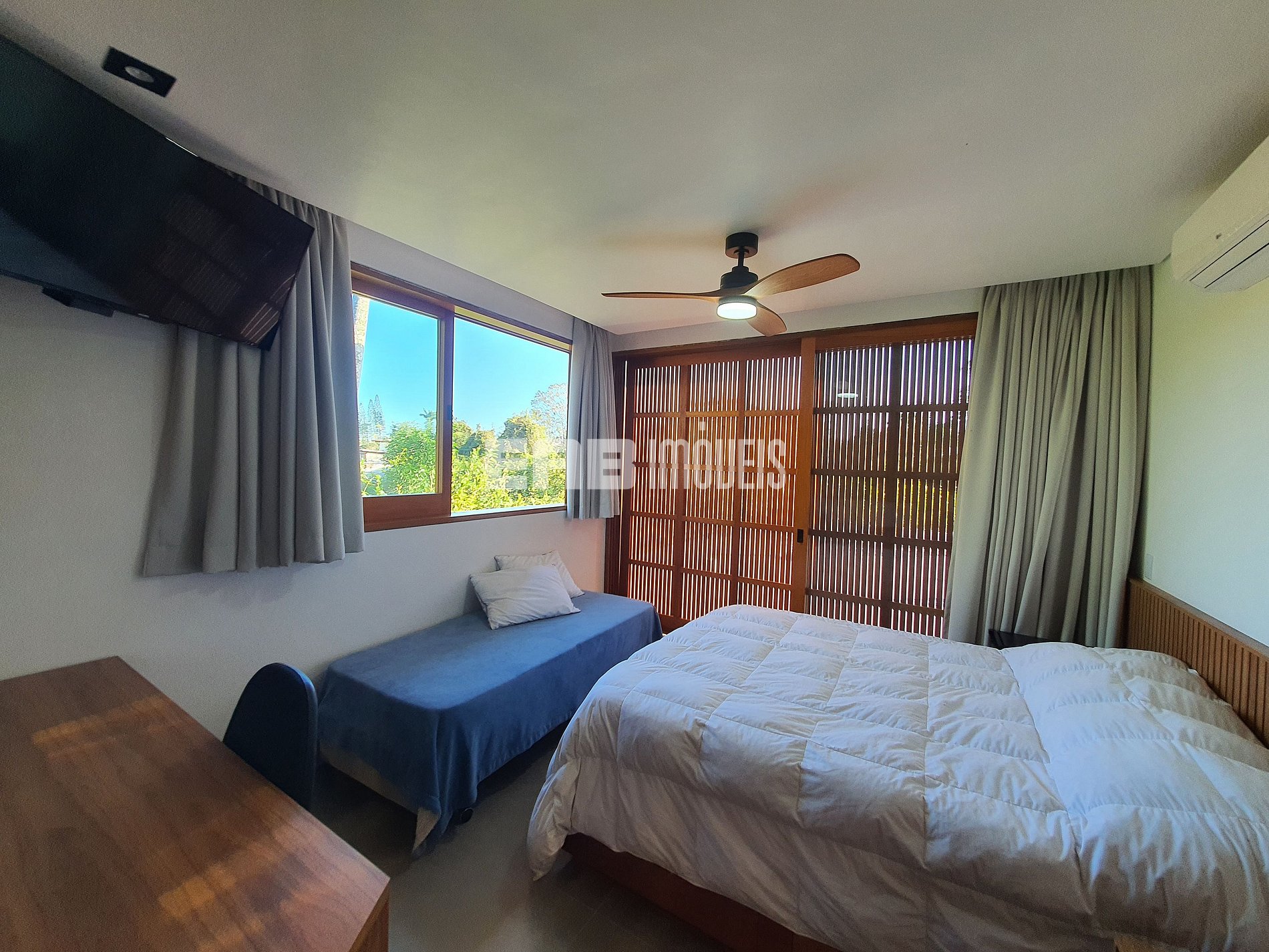 Quarto 3 (suíte): 1 cama de casal queen, 1 cama de solteiro, ventilador de teto, ar condicionado